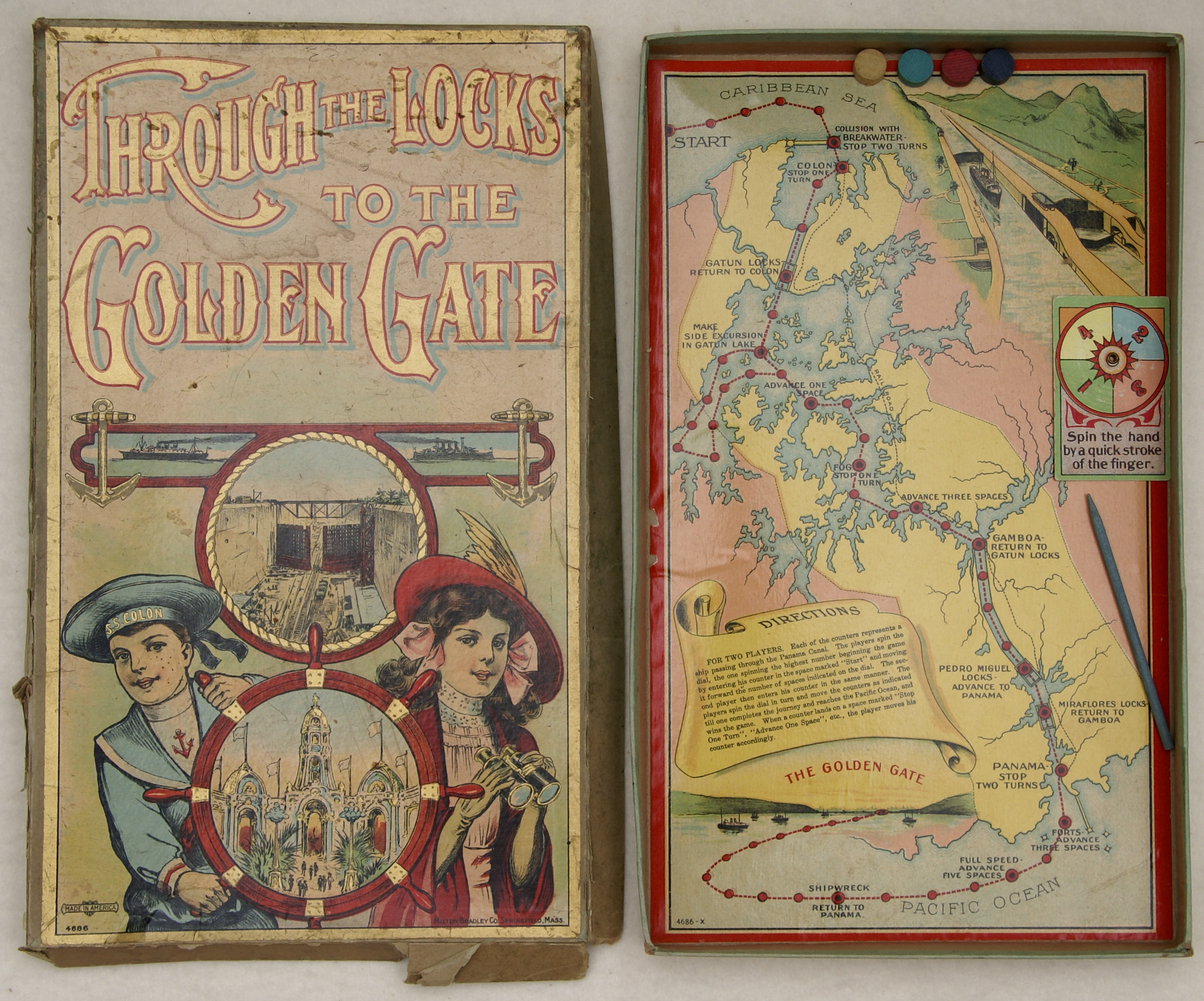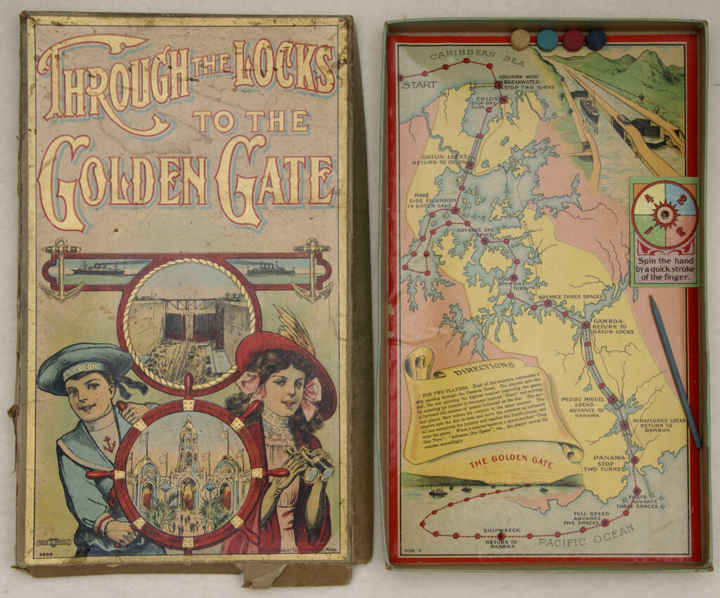 The Through the Locks to the Golden Gate game by Milton Bradley depicts passage of ships through the Panama Canal, which opened in 1914. (The Golden Gate here is not referring to the Golden Gate Bridge, which opened in 1937. Instead, it is likely referring to Golden Gate Park in San Francisco, the site of the Panama-Pacific International Exposition in 1915.)