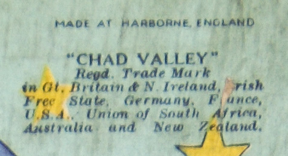 Text • "CHAD VALLEY" Regd. Trade Mark in Gt. Britain & N. Ireland, [I]rish Free State, Germany, F[r]ance, U.S.A., Union of South Africa, Australia and New Zealand.