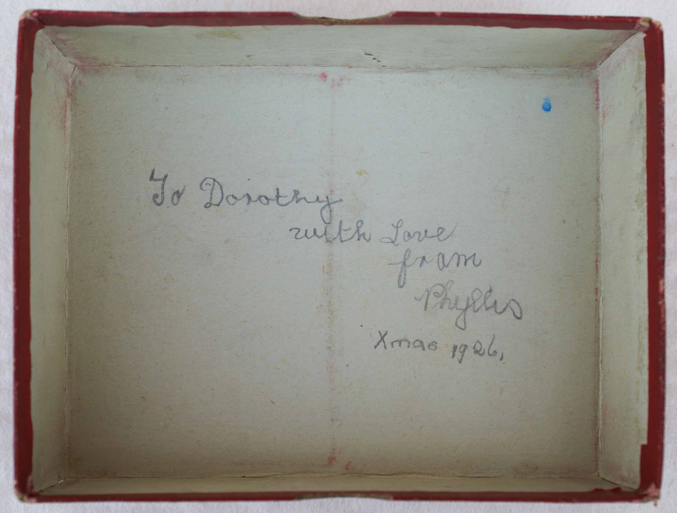 Handwritten date under box lid of a Chad Valley Tiddley Winks game • To Dorothy with Love from Phyllis Xmas 1926