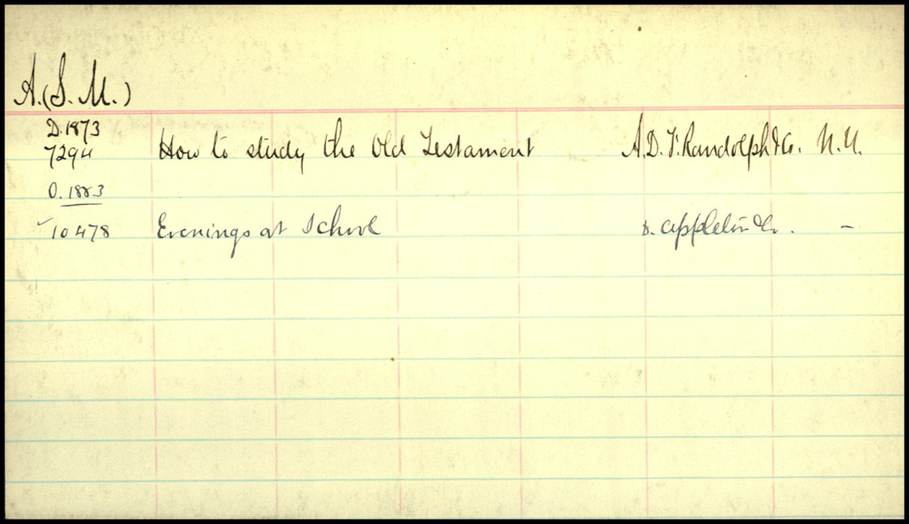 In the upper left of this card, above the line, the header entry text, “A. (S. M.)”, appears. This indicates that the author’s initials are S. M. A., with “A.” being the initial of the last name, which is used in sorting the card against others in the drawer. The “(S. M.)” is used to sort against others registered with a last name initial of “A.”, e.g. “A. (E. W.)”.