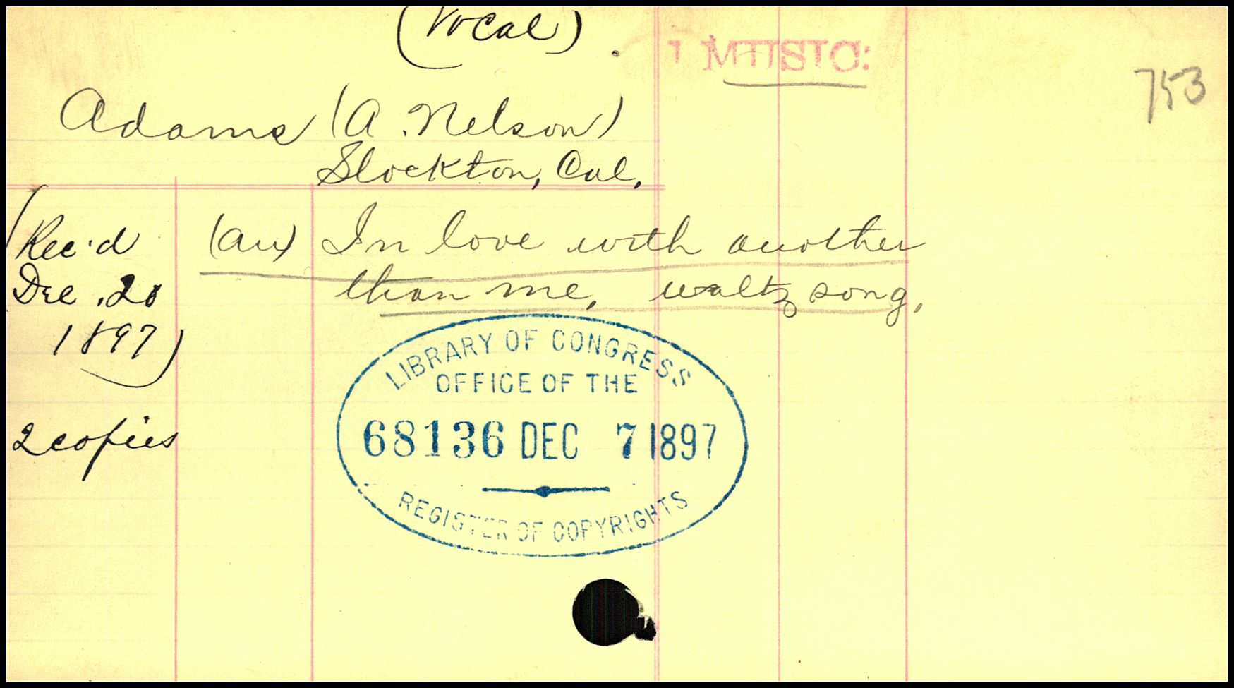 This card was produced by the Library of Congress for use in its card catalog though here it appears because it was included in the U.S. Copyright Office copyright card catalog drawers.