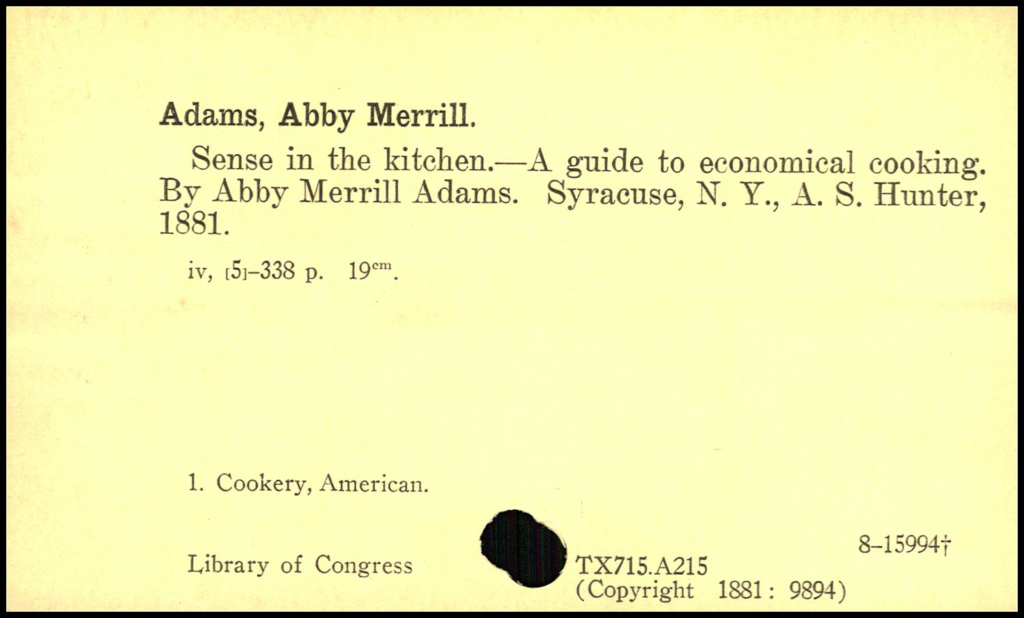 The above card contains entirely preprinted information about a book by “Adams, Abby Merrill” called “Sense in the kitchen – A guide to economical cooking”, published by “A. S. Hunter”, which was copyrighted in “1881” with registration number “9894”.