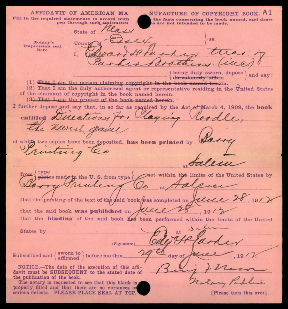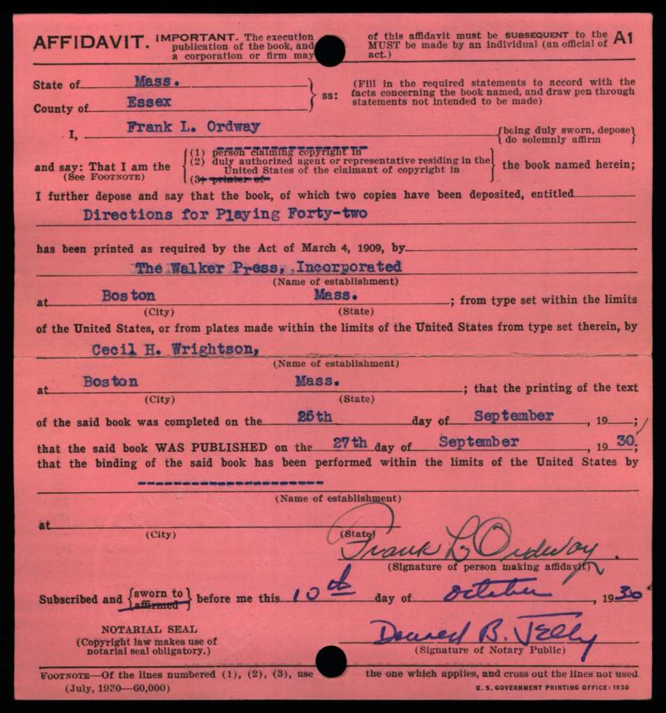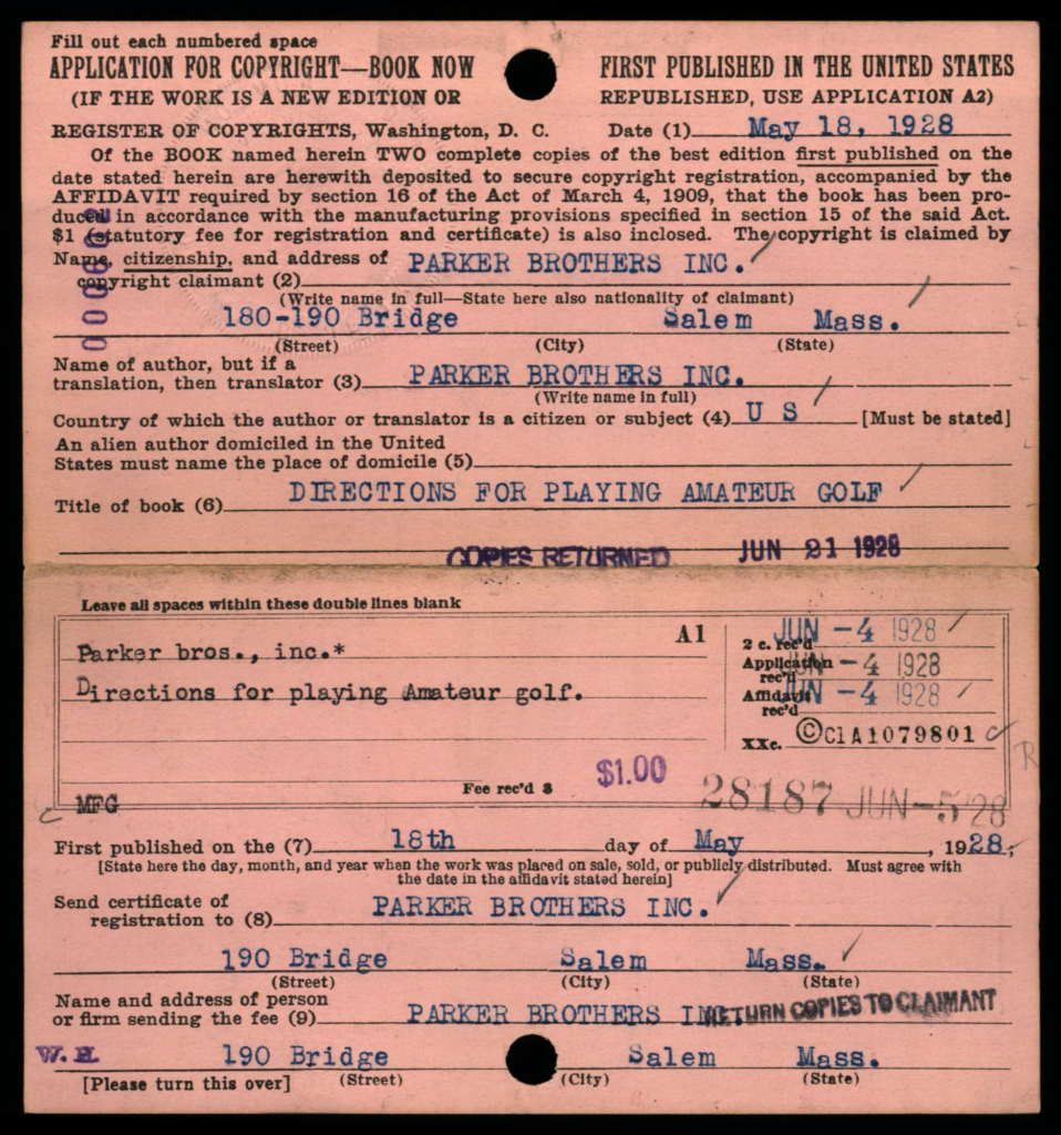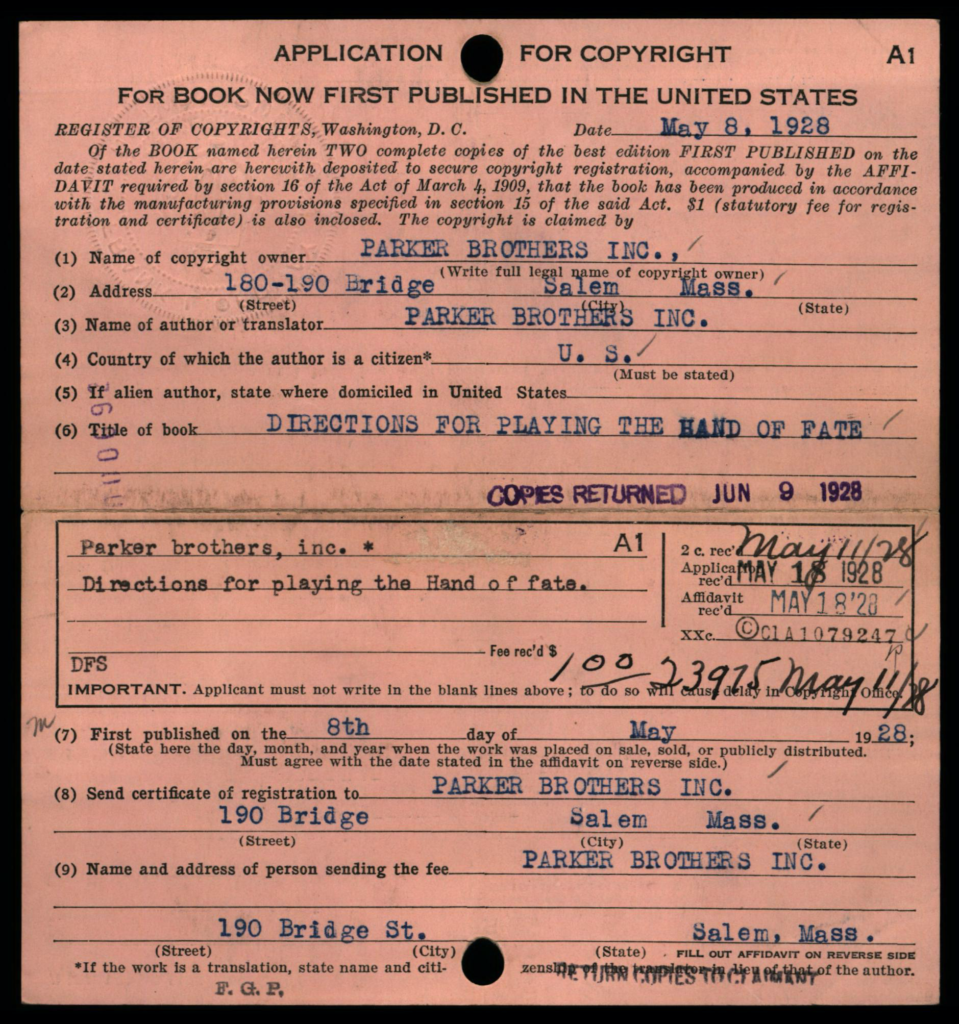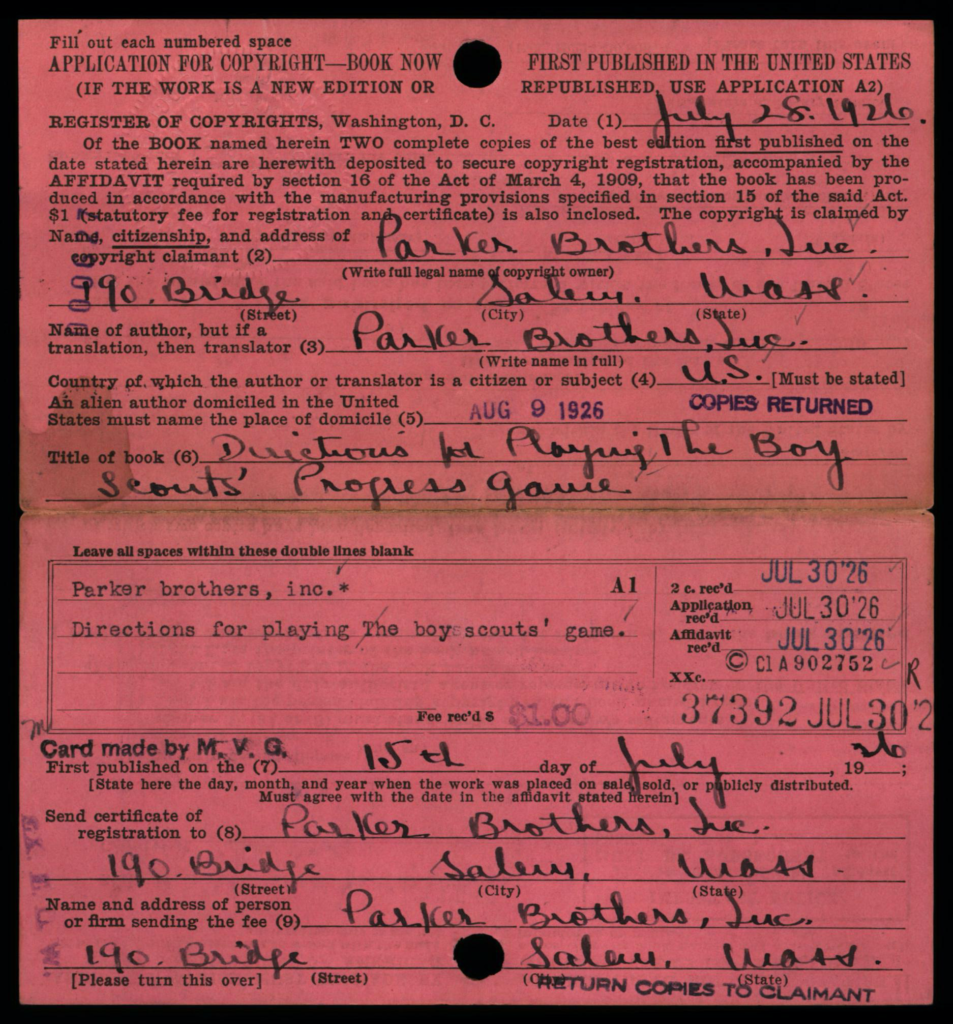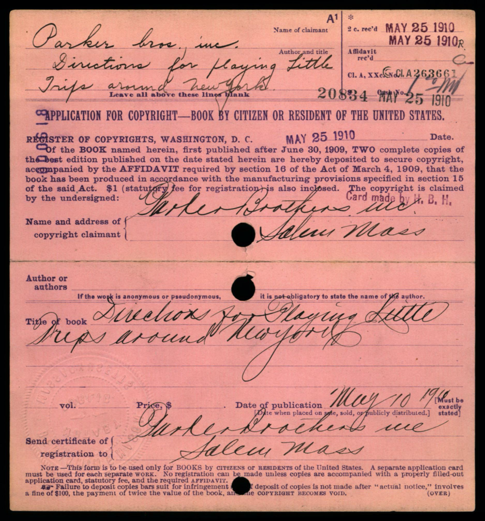 Each copyright application was required to be accompanied 2 best copies of the actual work as a mandatory deposit; these copies were not necessarily required to be submitted at the same time as the application, but shortly thereafter. Typically, mandatory deposit books were incorporated into the collections of the Library of Congress. However, the Copyright Office typically did not retain deposited copies of game rules and instructions; in early years such as on this card, the copies were returned to the claimant, as indicated by the ink-stamped notation at lower right: “Copies Returned SEP 10 1912 Bk. D. 14 P. 320”.