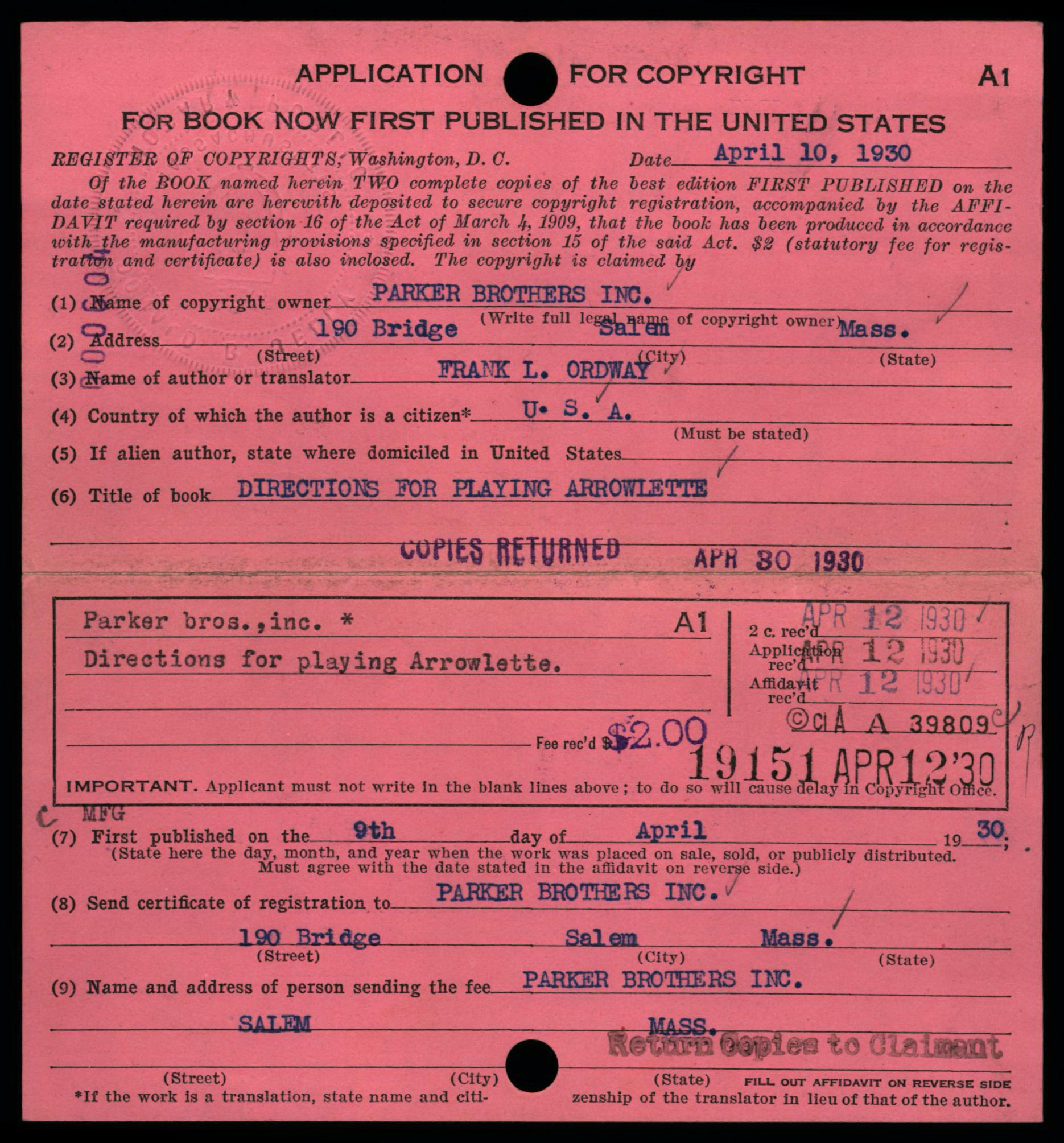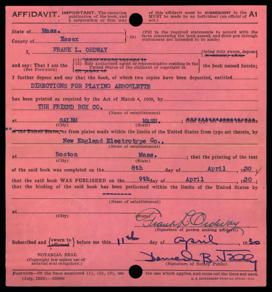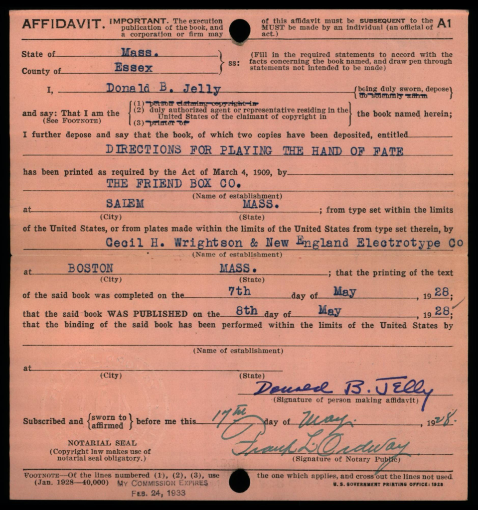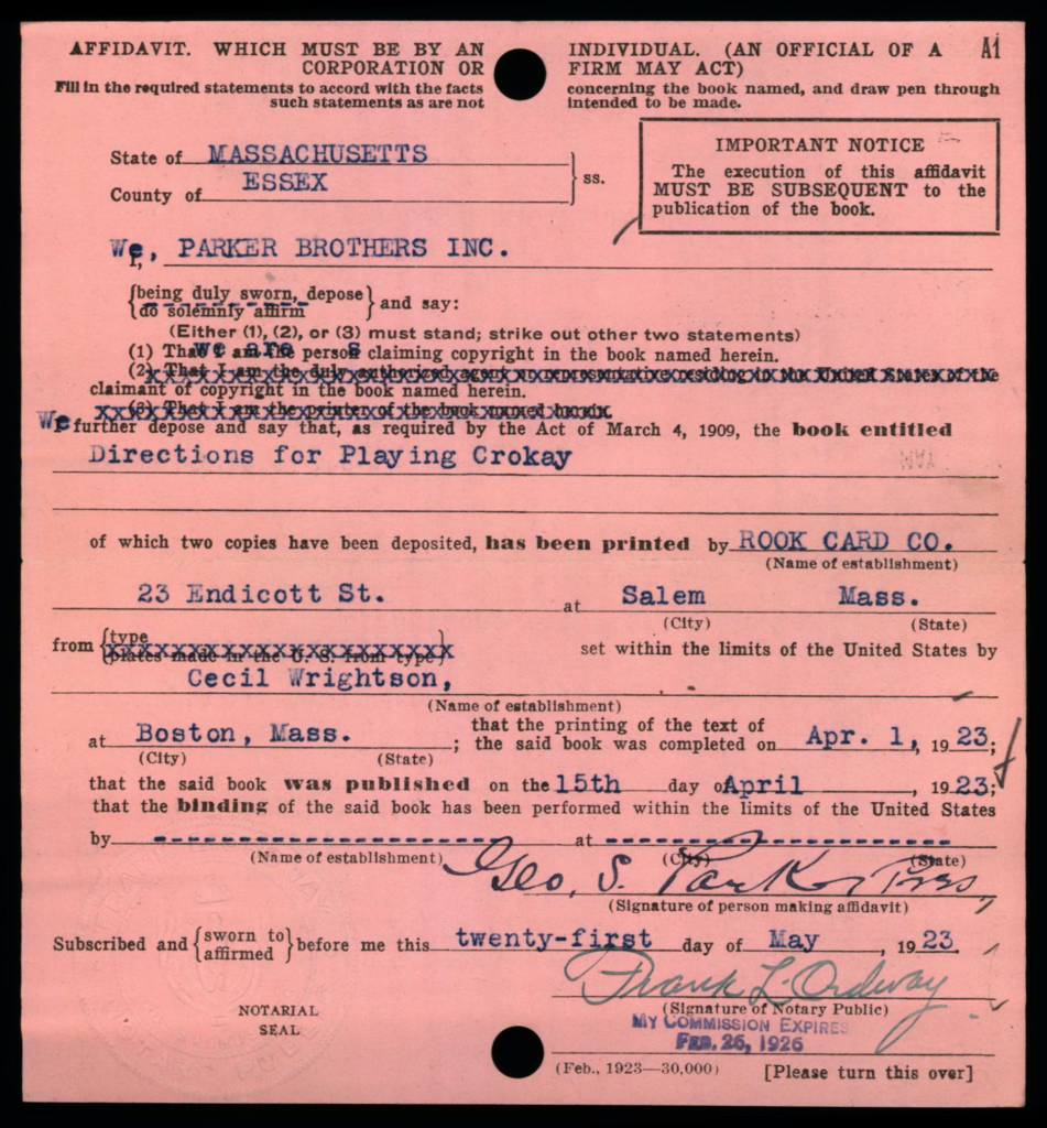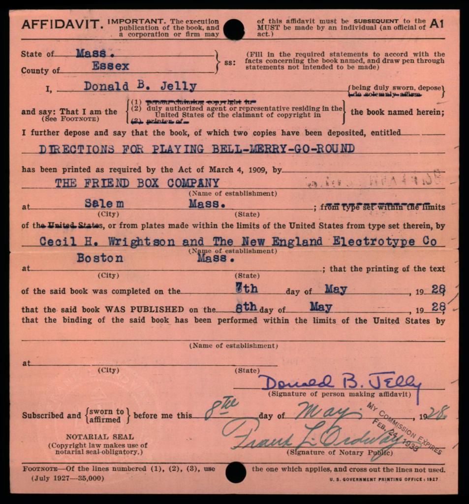 Each copyright application was required to be accompanied 2 best copies of the actual work as a mandatory deposit; these copies were not necessarily required to be submitted at the same time as the application, but shortly thereafter. Typically, mandatory deposit books were incorporated into the collections of the Library of Congress. However, the Copyright Office typically did not retain deposited copies of game rules and instructions; in early years such as on this card, the copies were returned to the claimant, as indicated by the ink-stamped notation at lower right: “Copies Returned SEP 10 1912 Bk. D. 14 P. 320”.