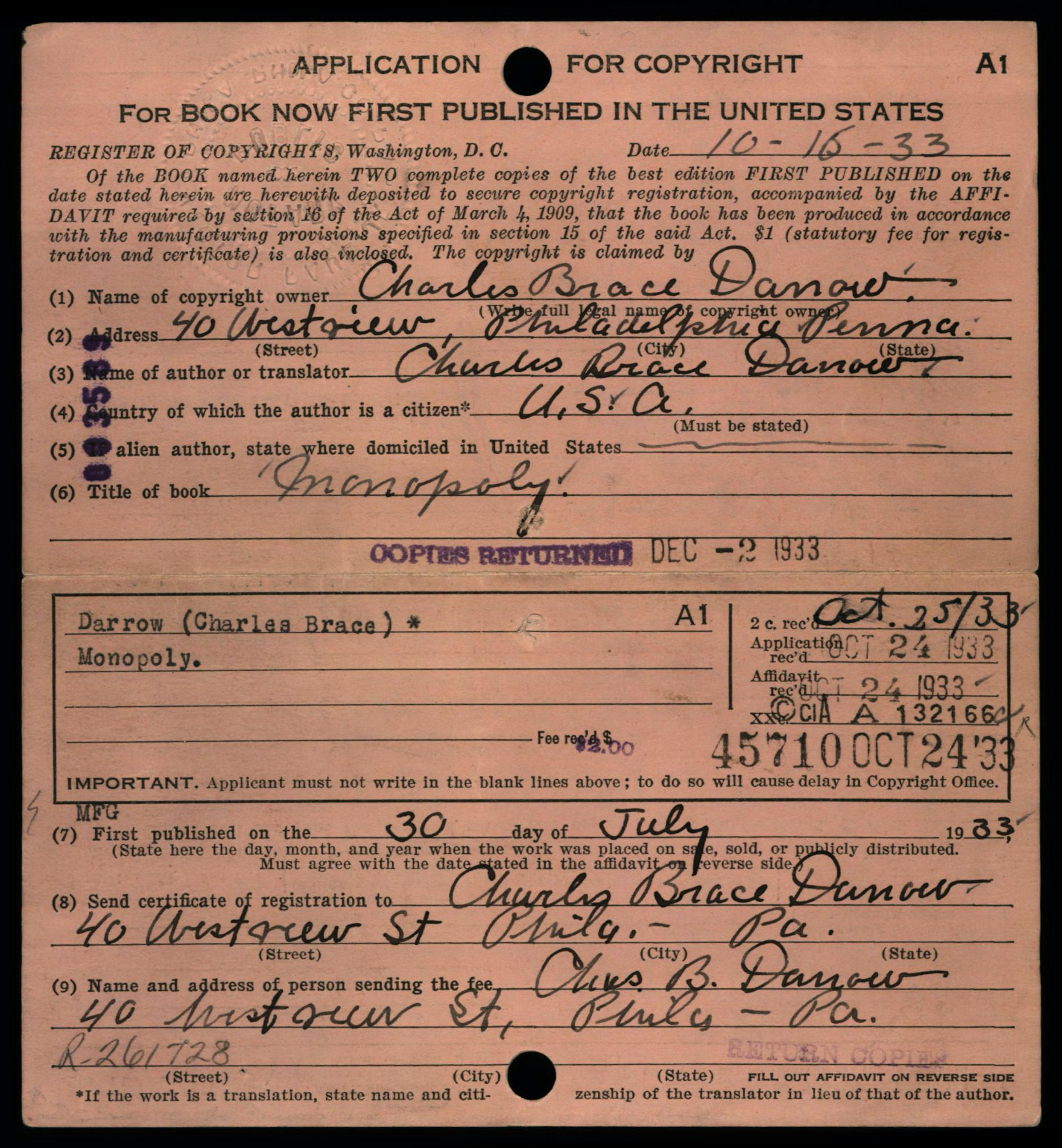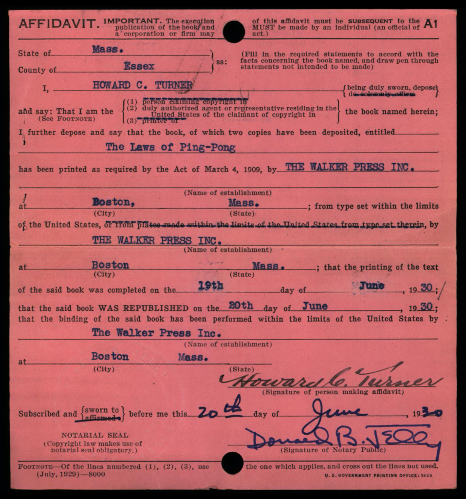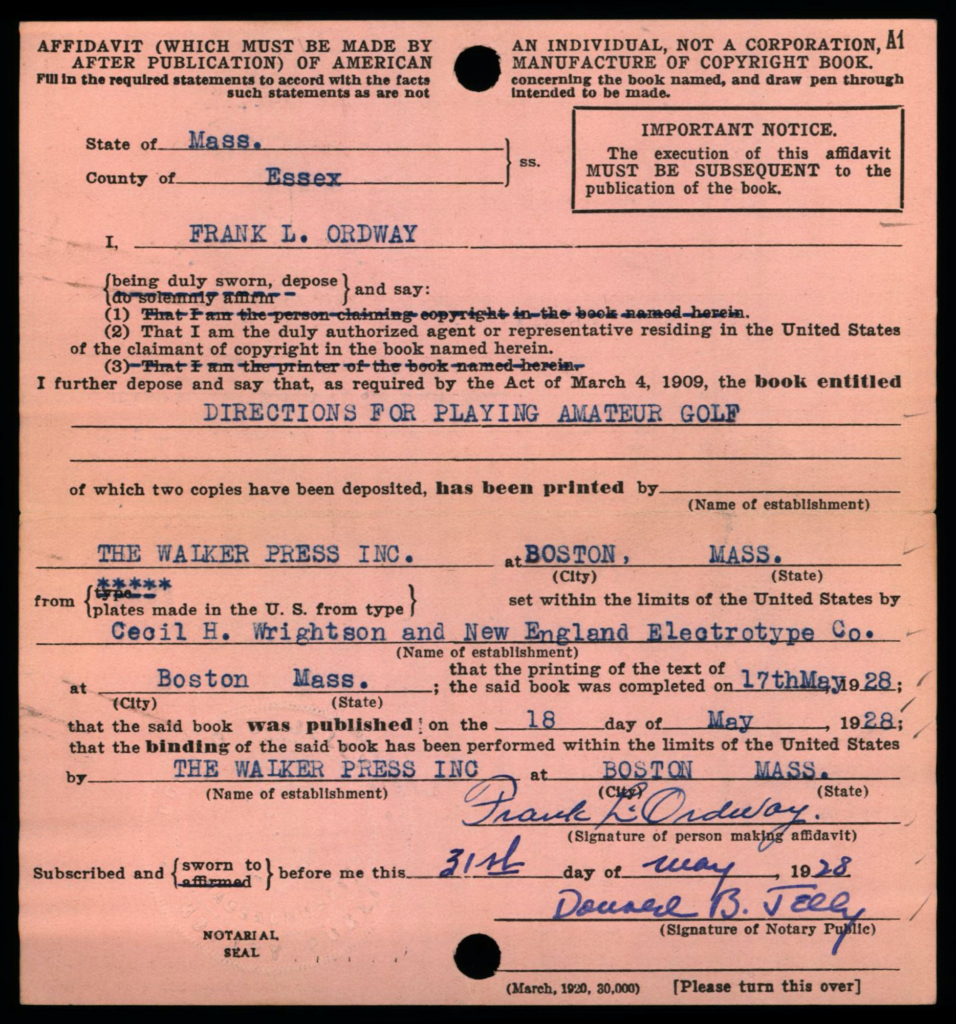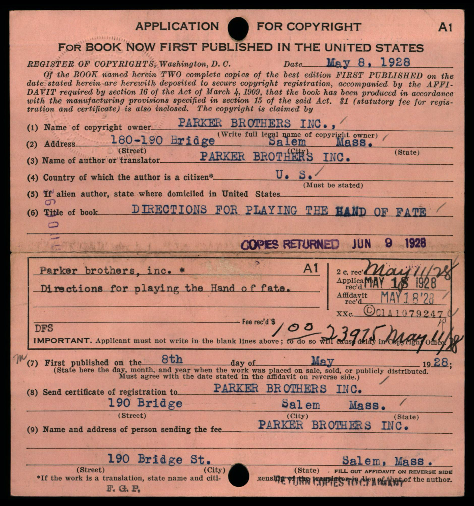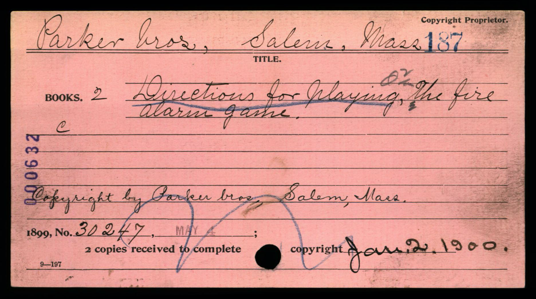 Each copyright application was required to be accompanied 2 best copies of the actual work as a mandatory deposit; these copies were not necessarily required to be submitted at the same time as the application, but shortly thereafter. Typically, mandatory deposit books were incorporated into the collections of the Library of Congress. However, the Copyright Office typically did not retain deposited copies of game rules and instructions; in early years such as on this card, the copies were returned to the claimant, as indicated by the ink-stamped notation at lower right: “Copies Returned SEP 10 1912 Bk. D. 14 P. 320”.