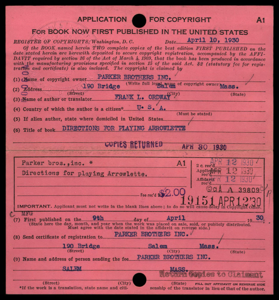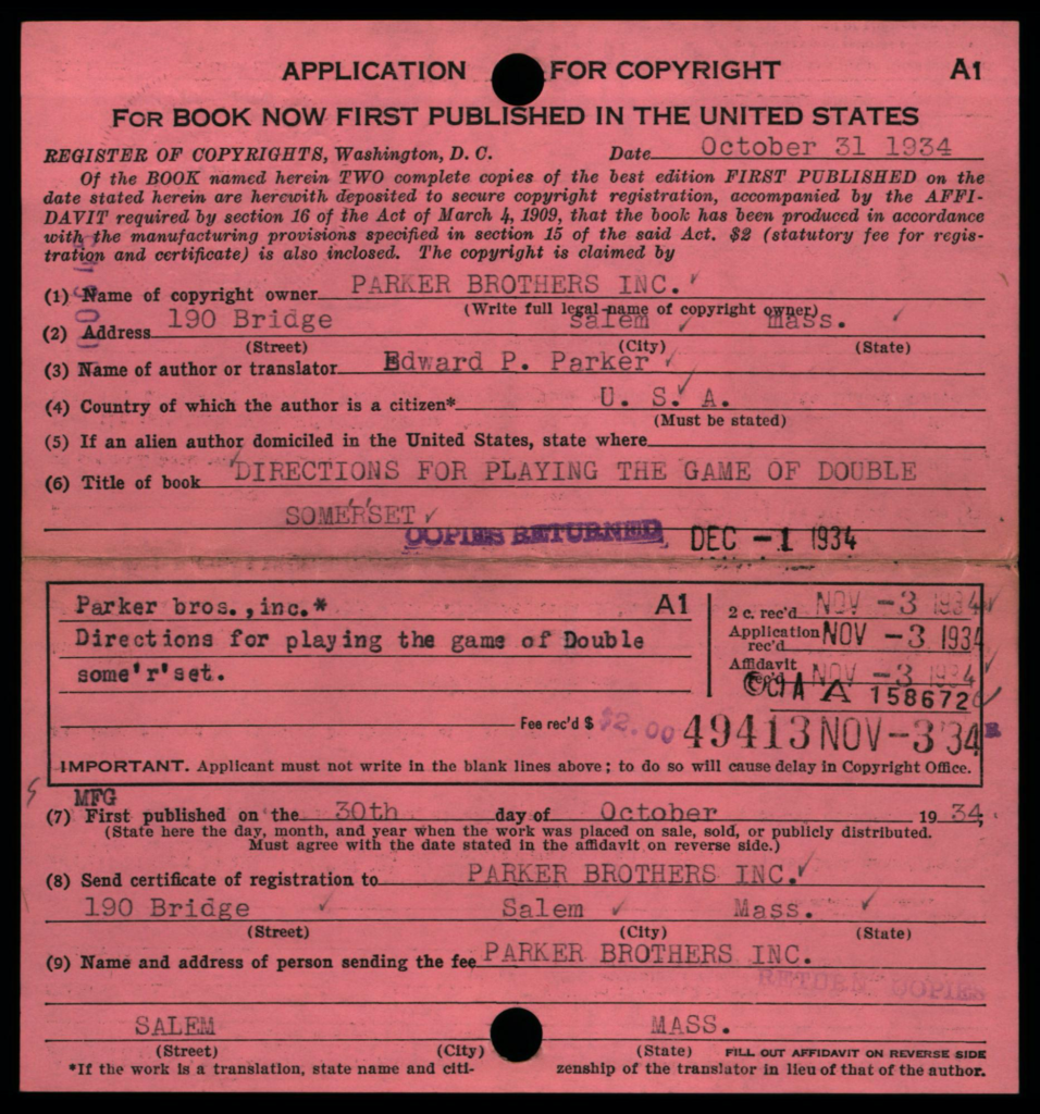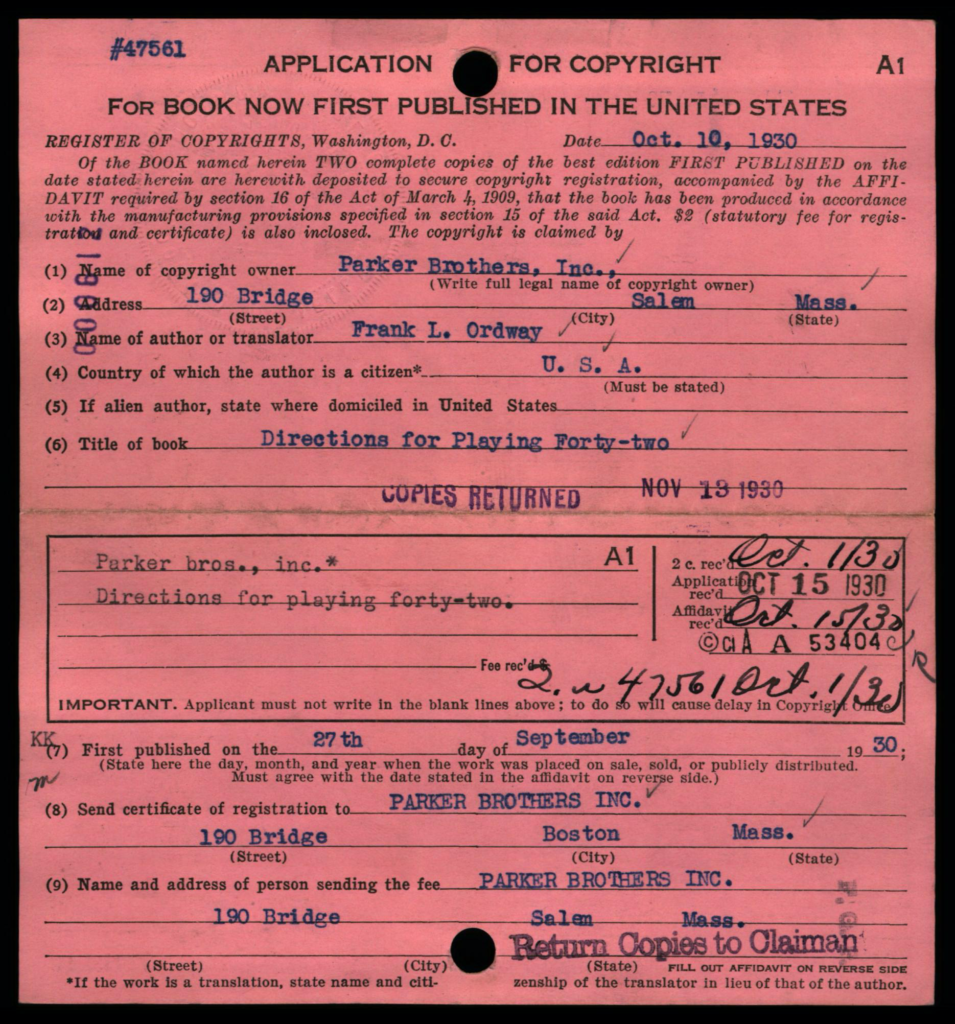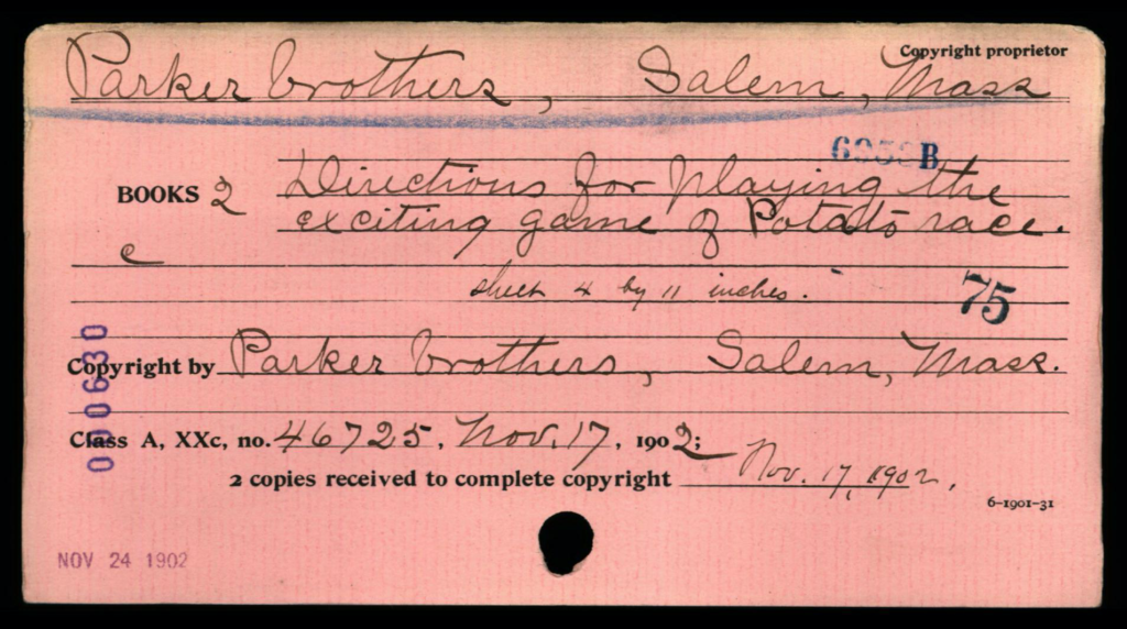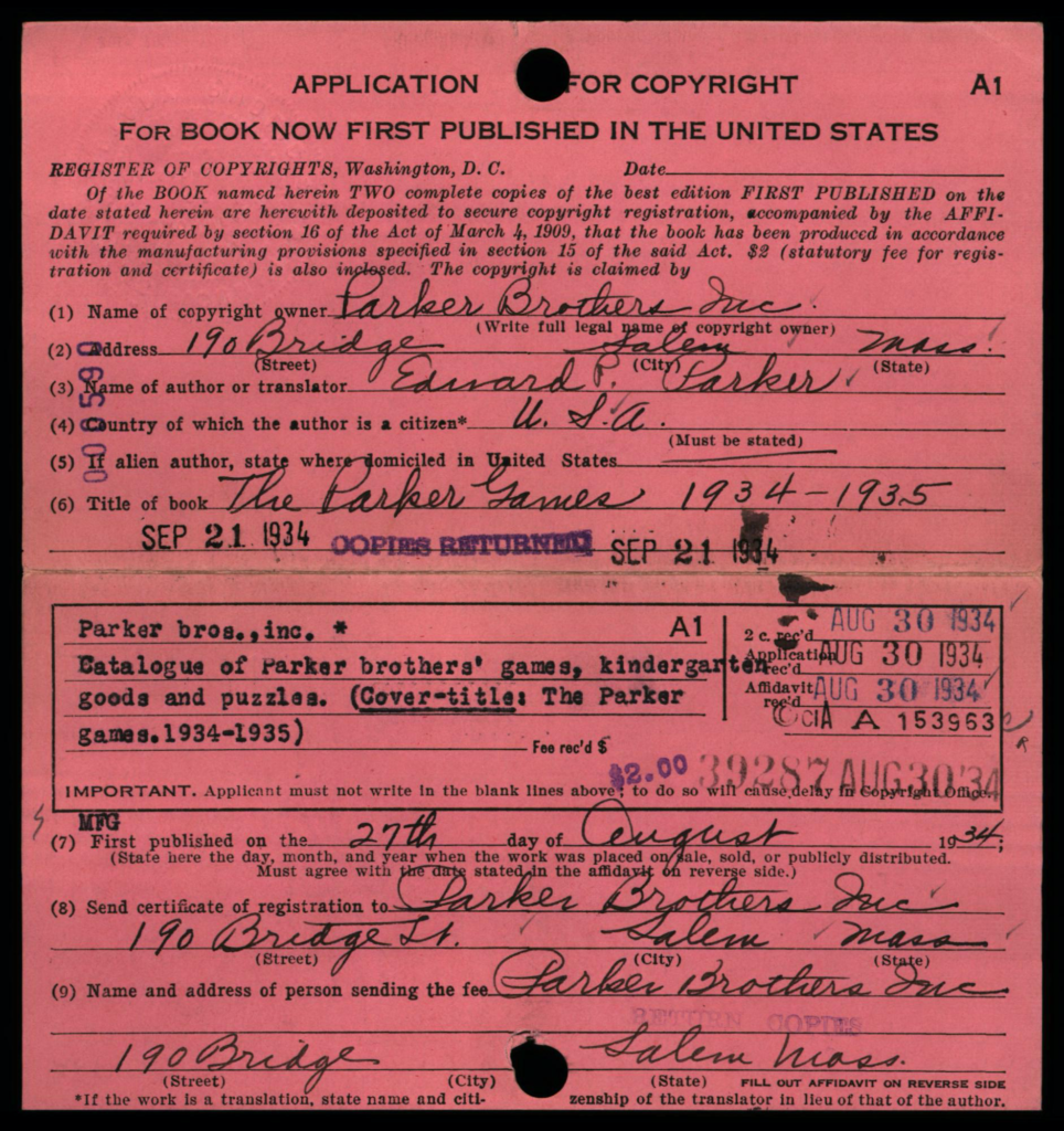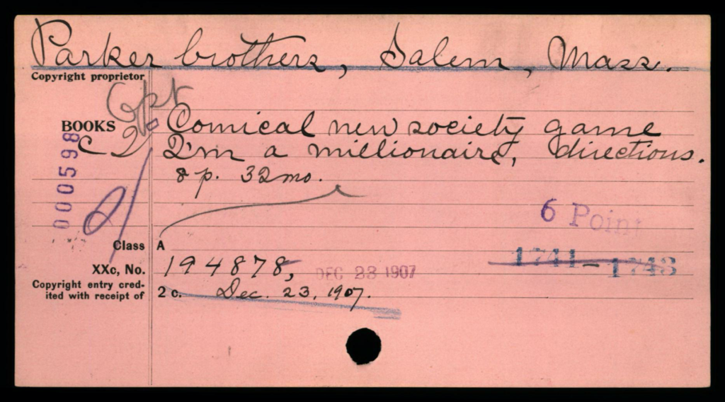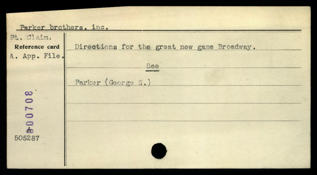 Depending on the timeframe of when registered, copyright cards for games may be filed in one or more places in the (virtual) copyright card catalog: under the copyright claimant’s name (e.g., Parker Brothers) and/or under the title of the work (see below, may not be the game name).