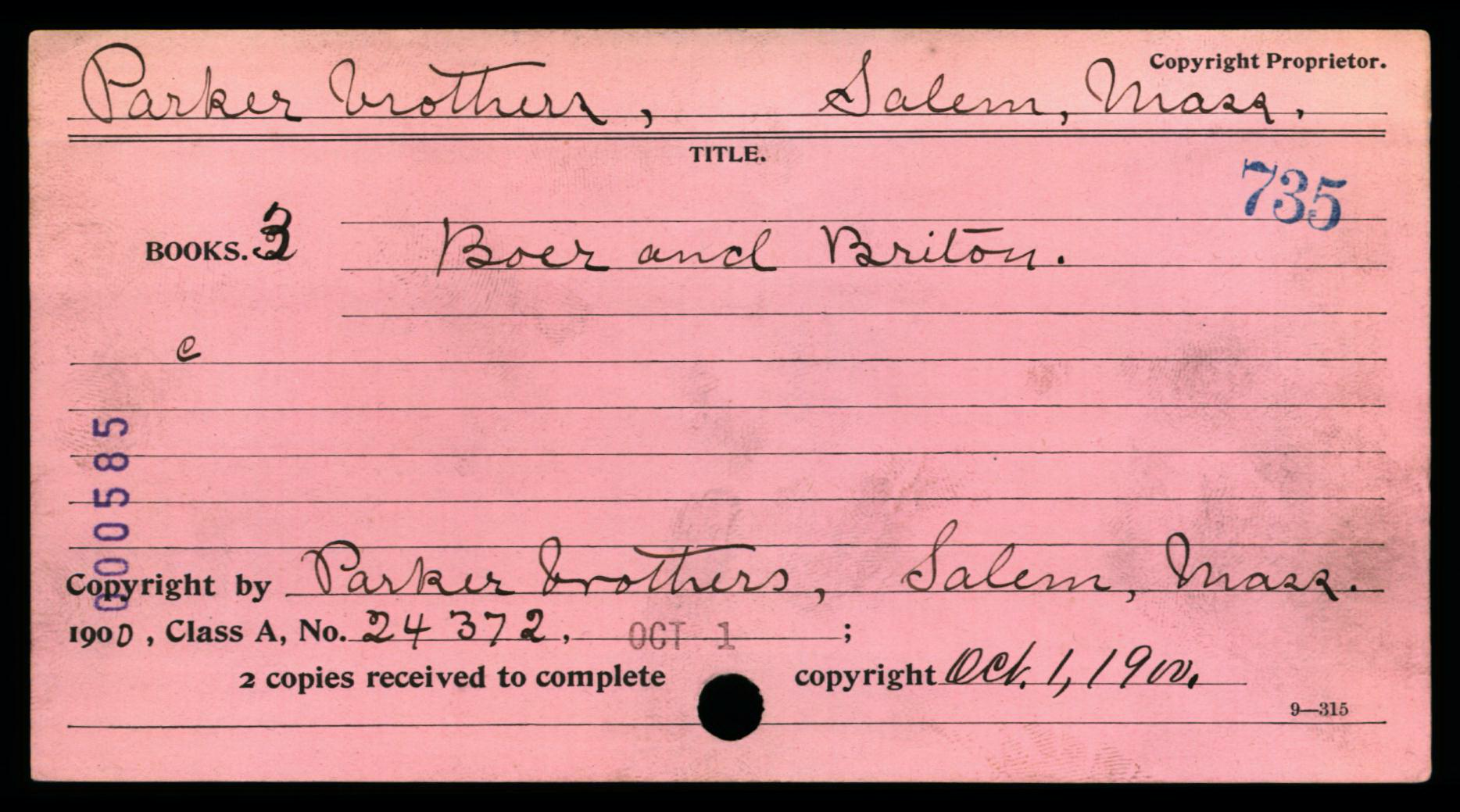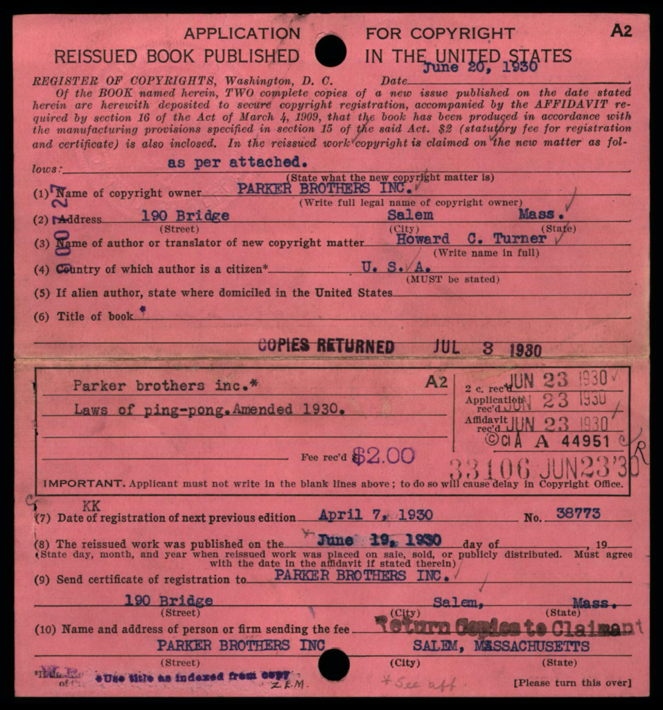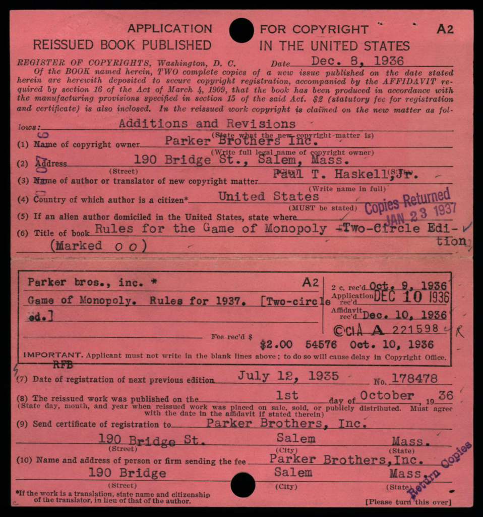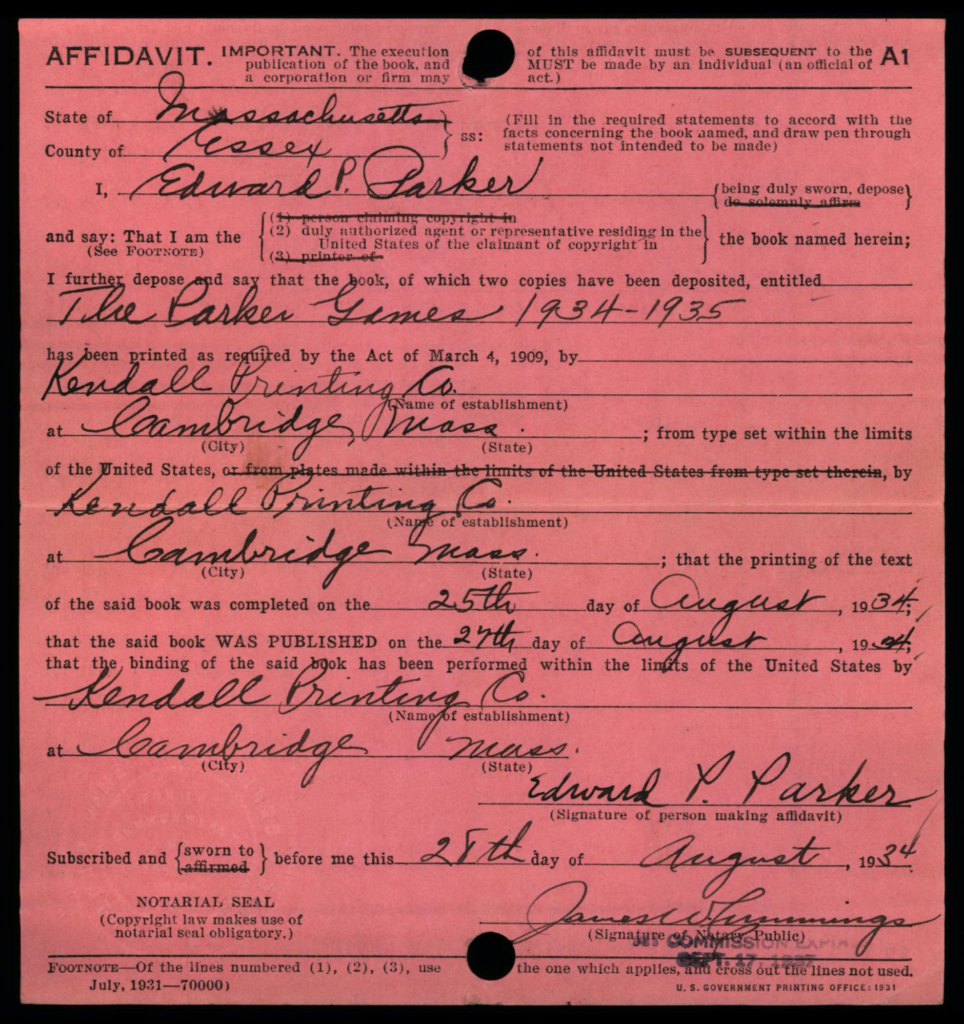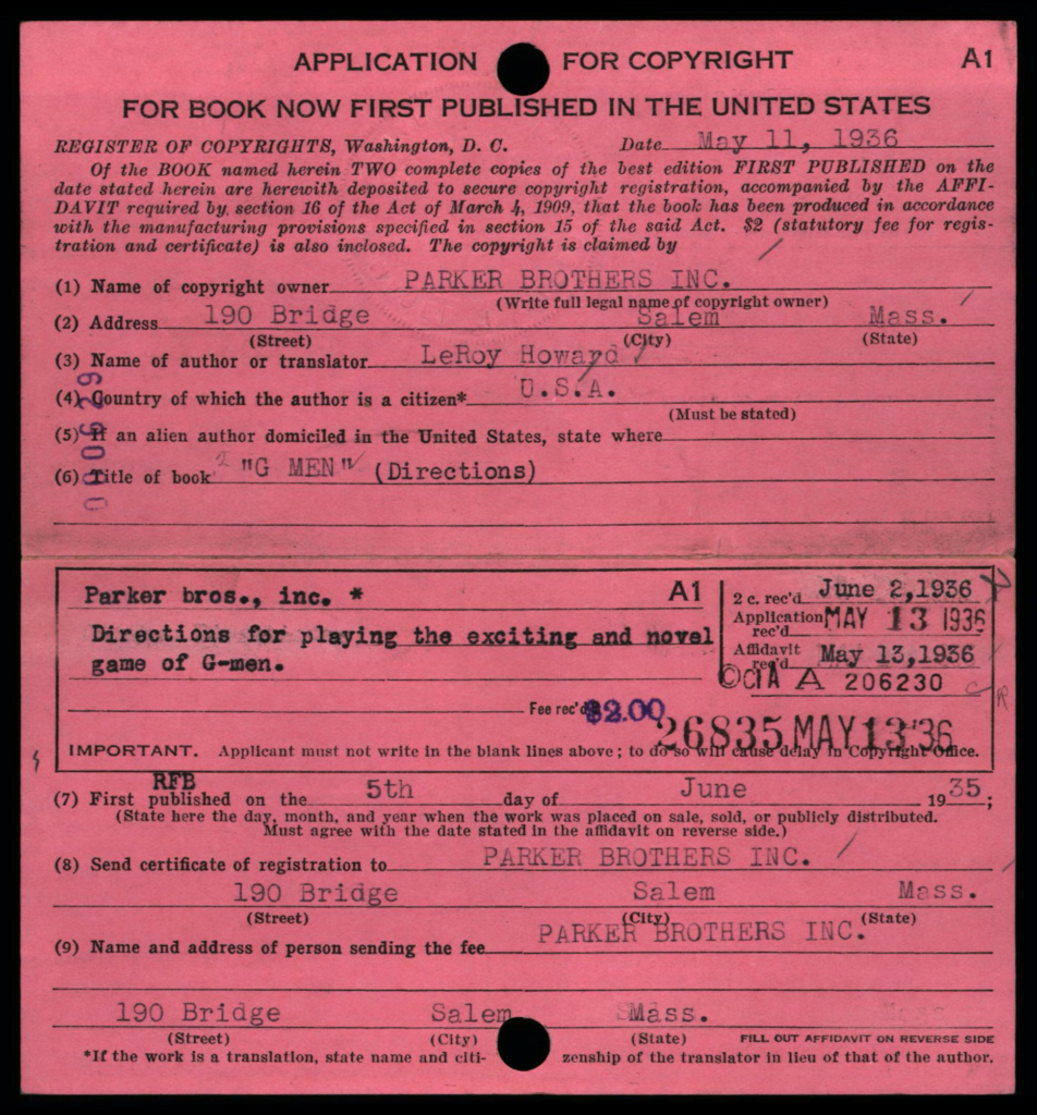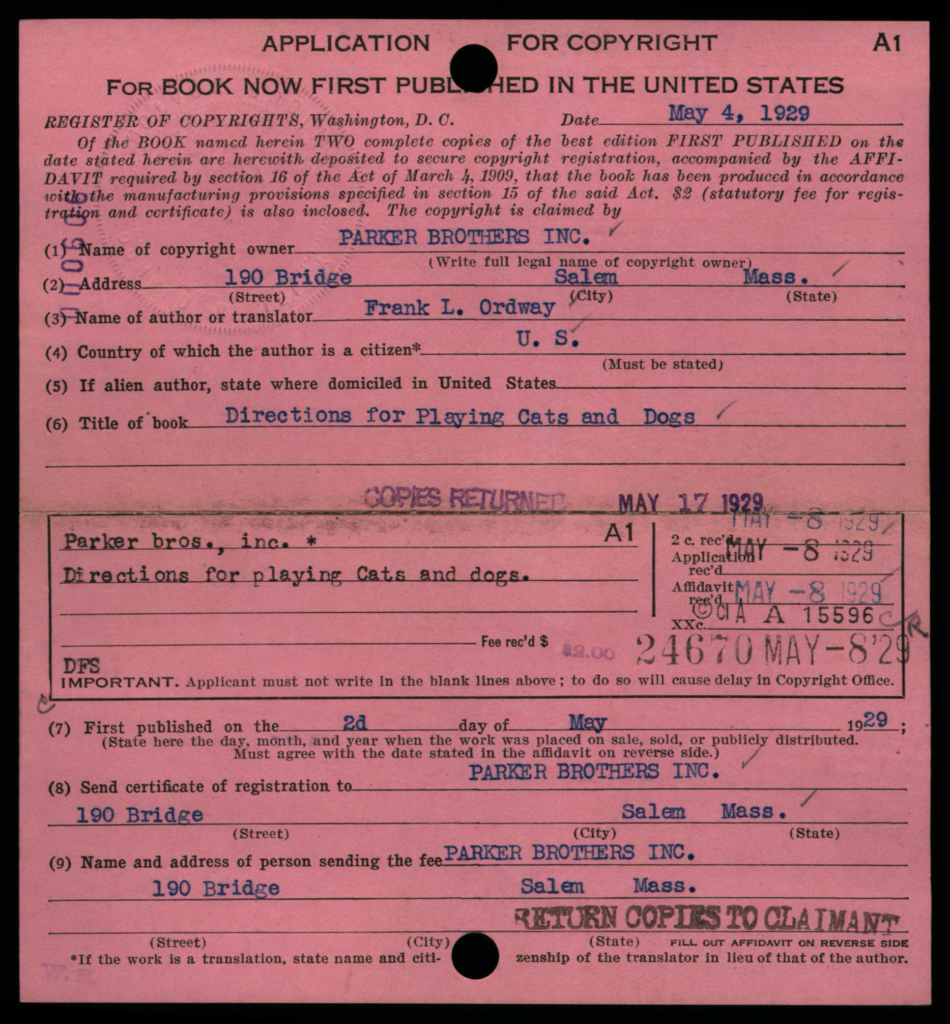 Depending on the timeframe of when registered, copyright cards for games may be filed in one or more places in the (virtual) copyright card catalog: under the copyright claimant’s name (e.g., Parker Brothers) and/or under the title of the work (see below, may not be the game name).