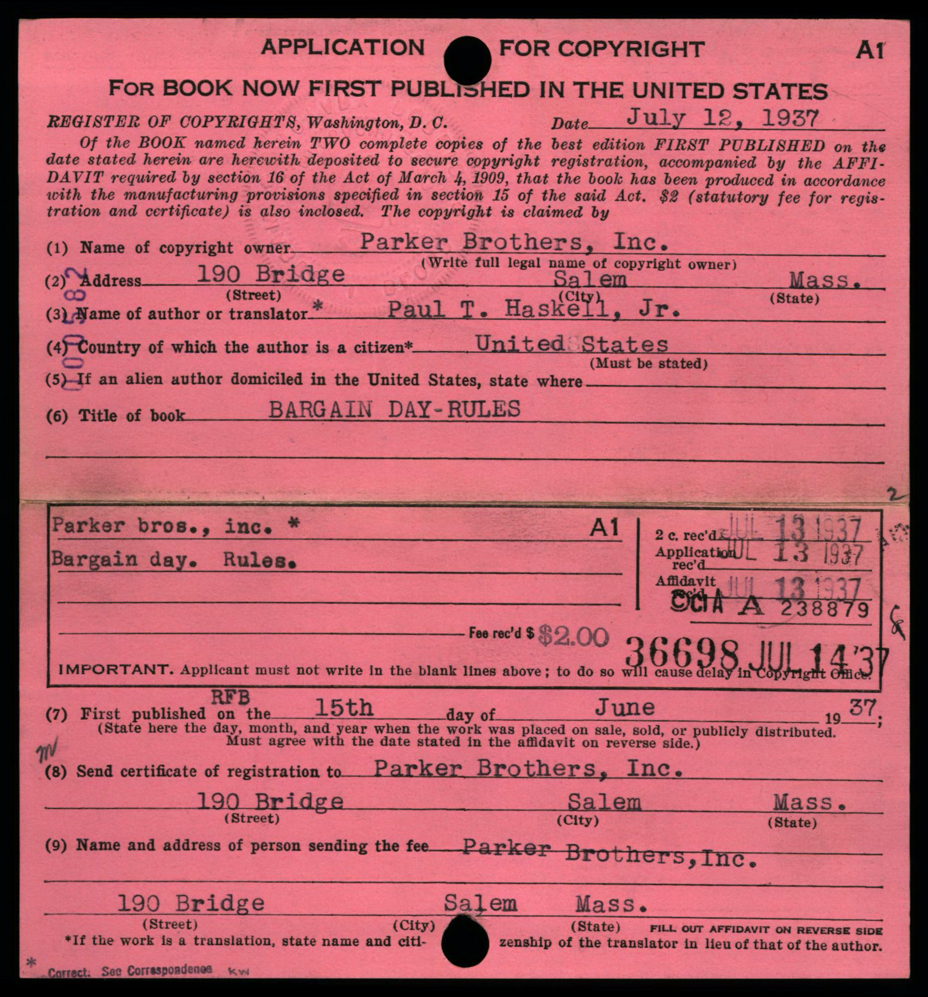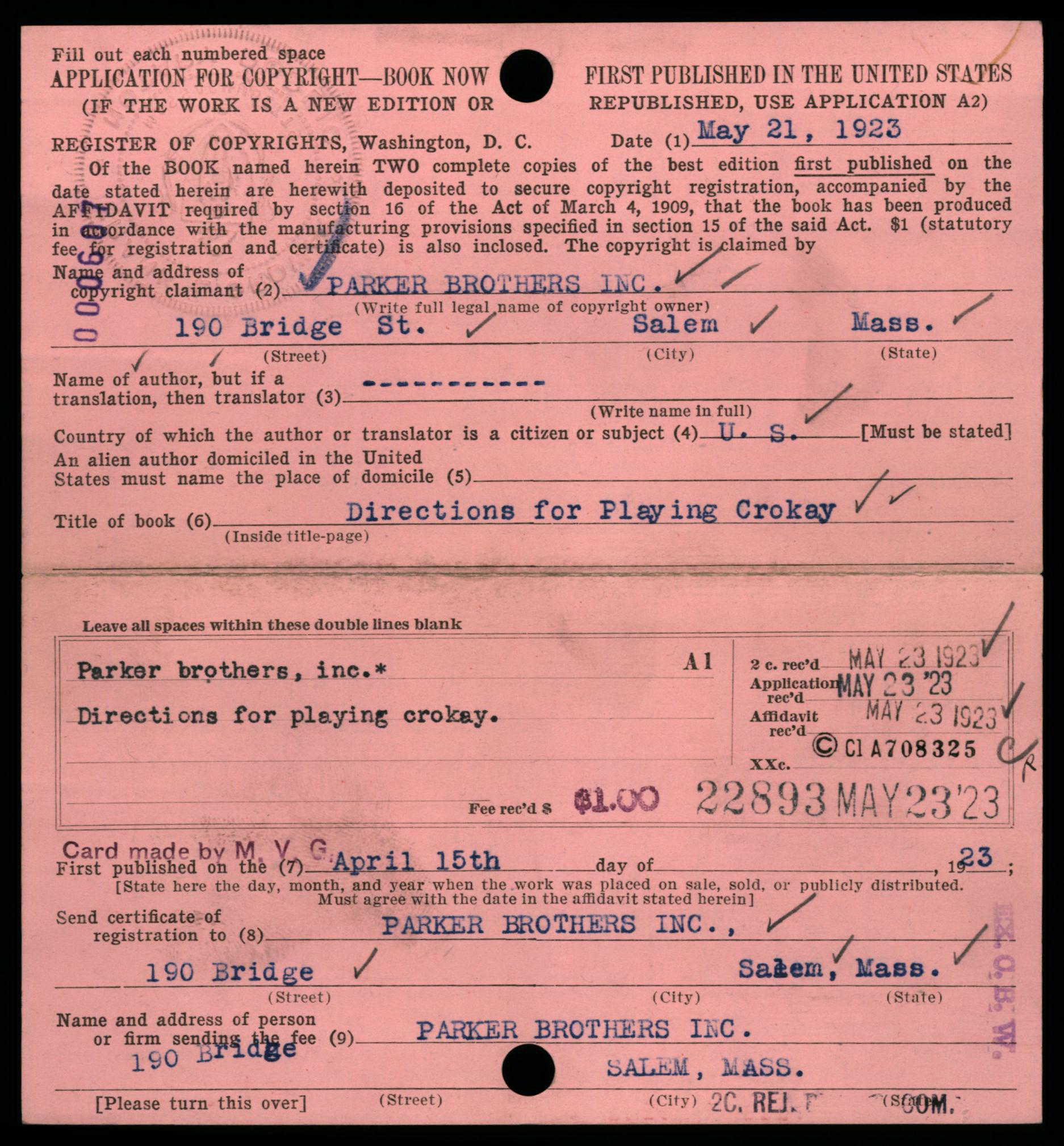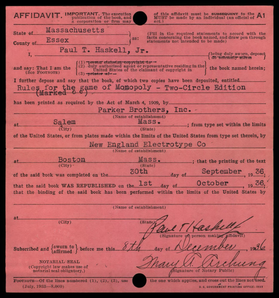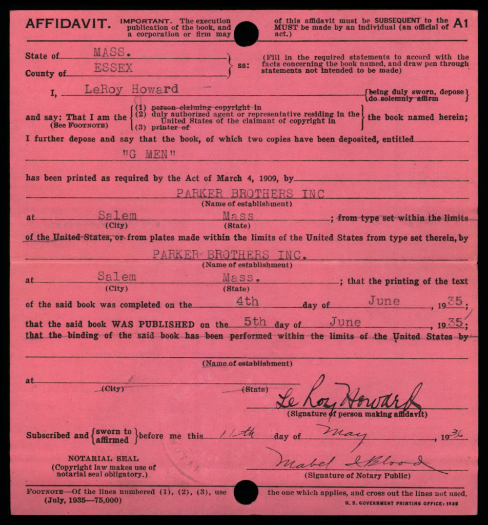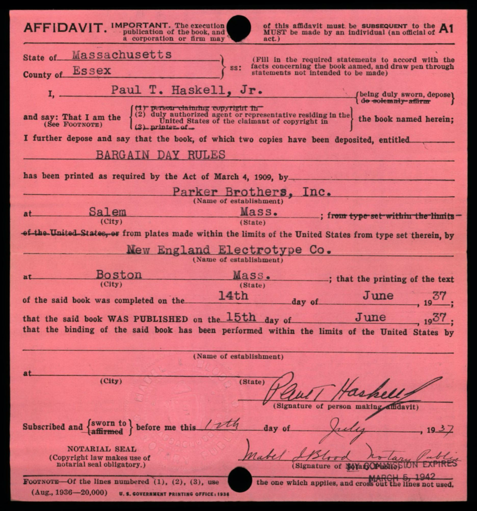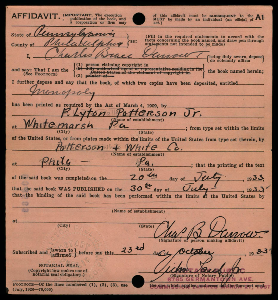 Depending on the timeframe of when registered, copyright cards for games may be filed in one or more places in the (virtual) copyright card catalog: under the copyright claimant’s name (e.g., Parker Brothers) and/or under the title of the work (see below, may not be the game name).