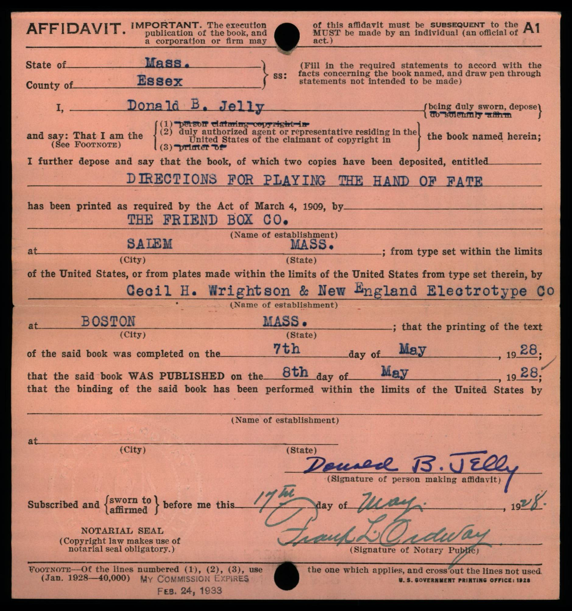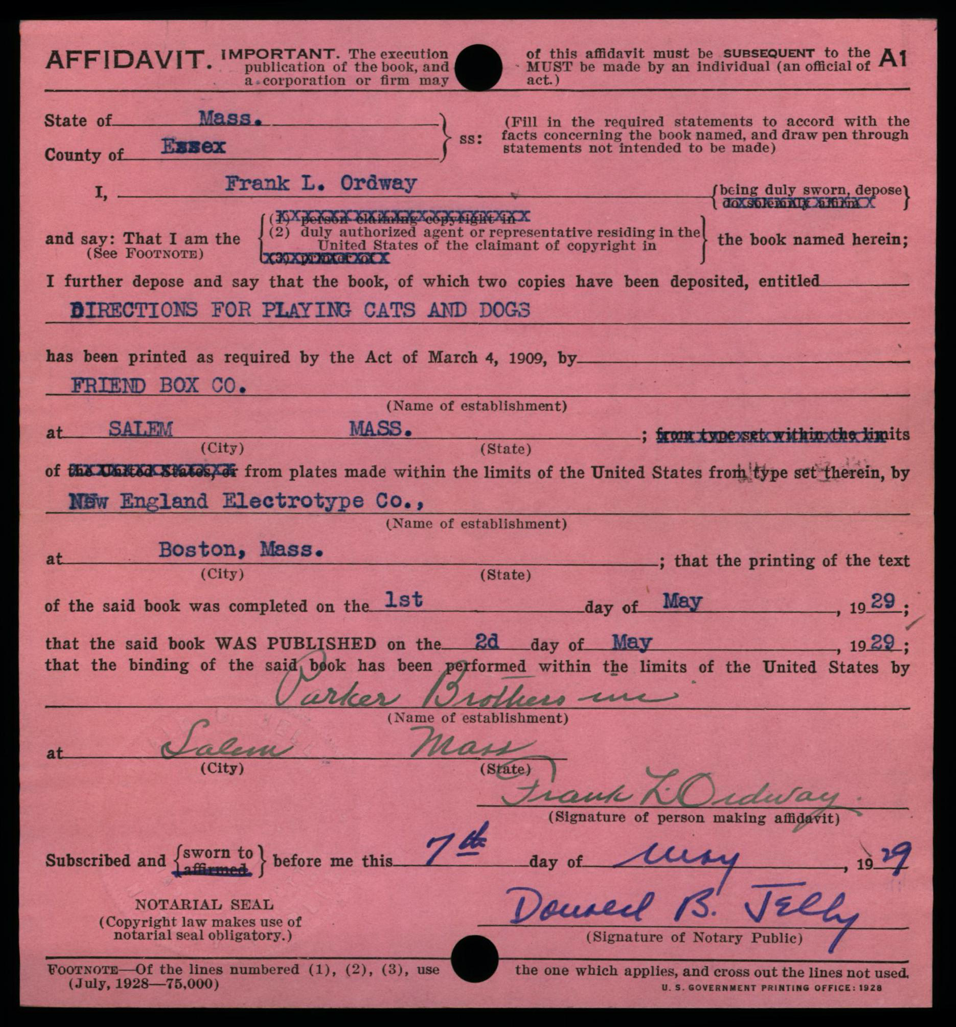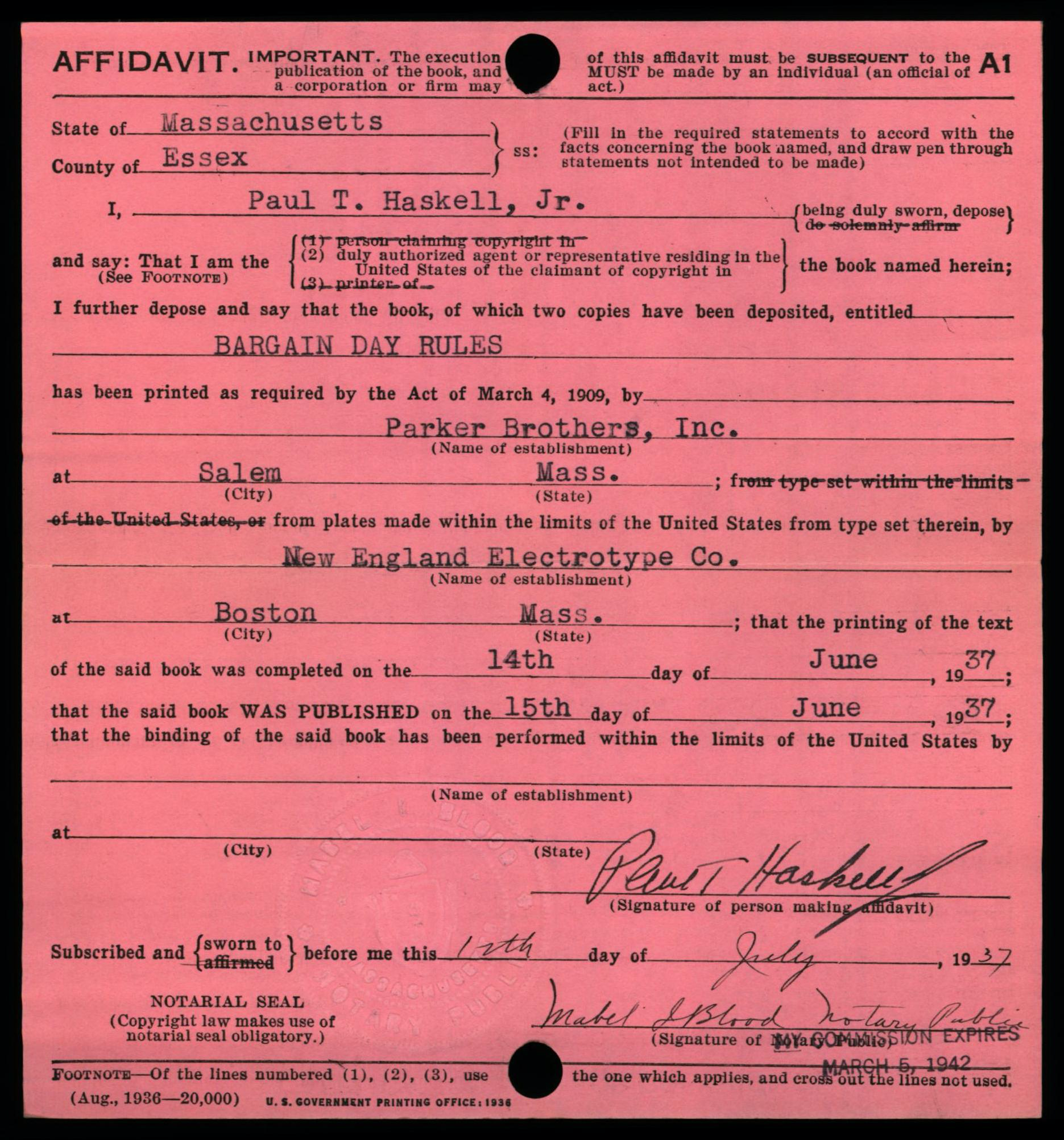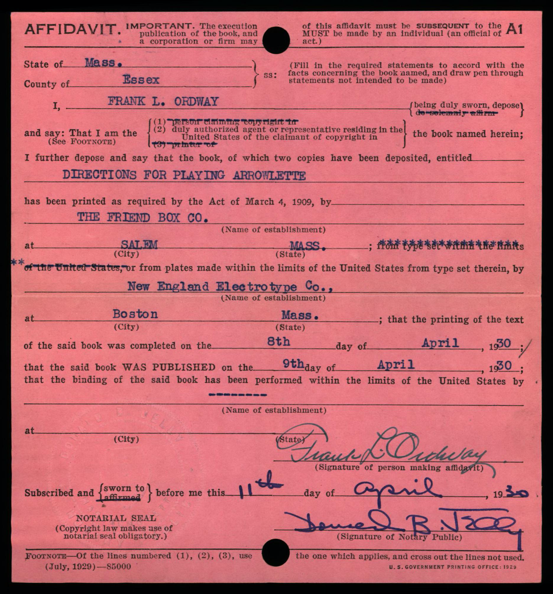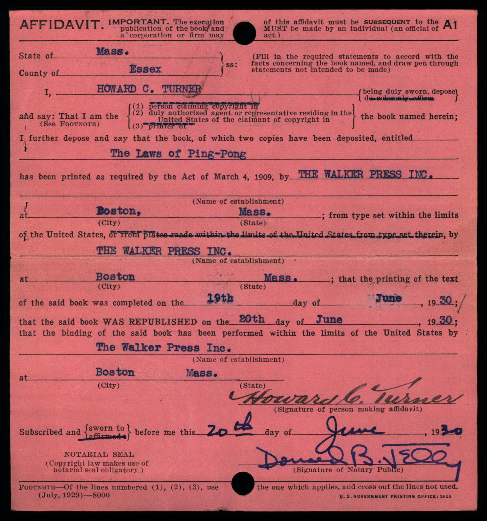 July 1930 Edition of Copyright Form A1