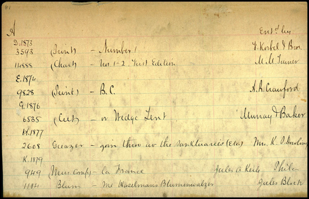 Note the letter “A” at upper left above the line. In this case, “A” is the first word of the title of a variety of works that were registered from 1873 to 1879 on this card.