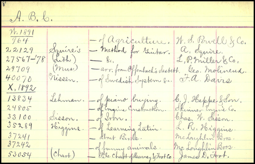 The card above contains works with titles starting with “A. B. C.”. The long dash (“–“) in each line item refers to “A. B. C.”, e.g., “A. B. C. of funny animals” registered by McLoughlin Bros. on the next-to-bottom entry.