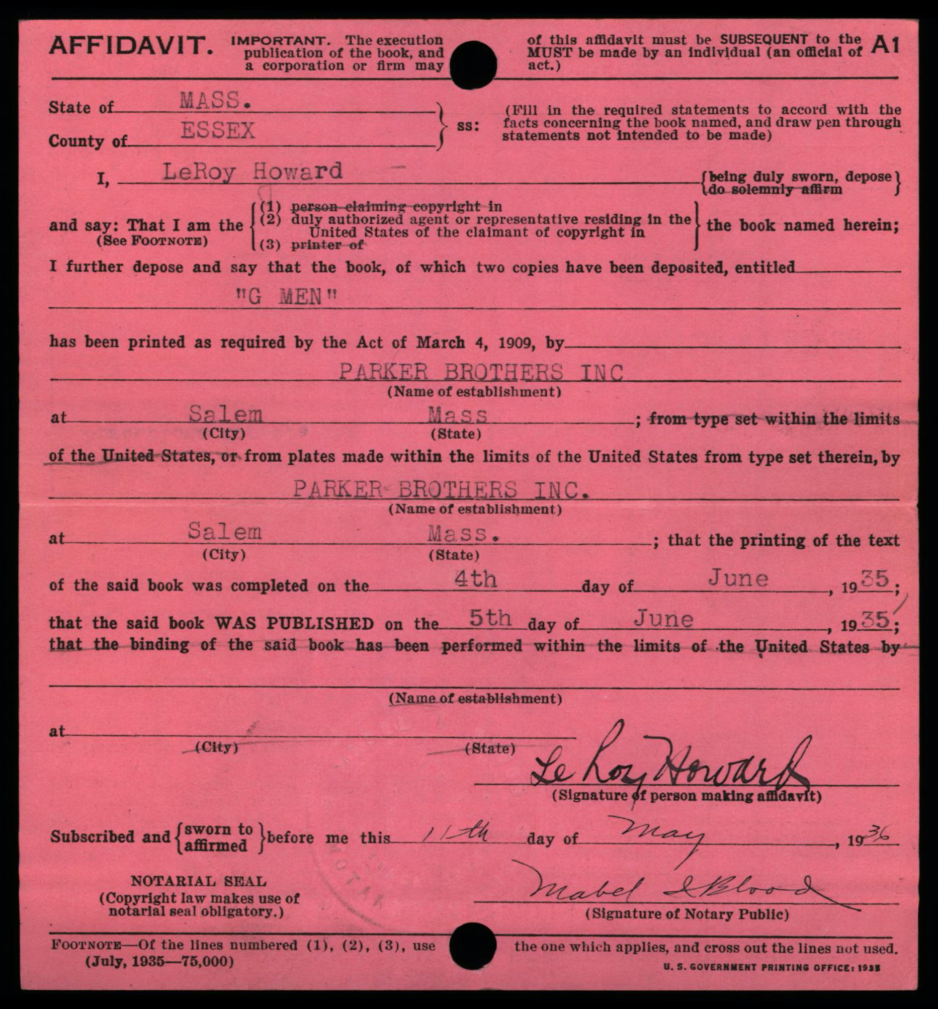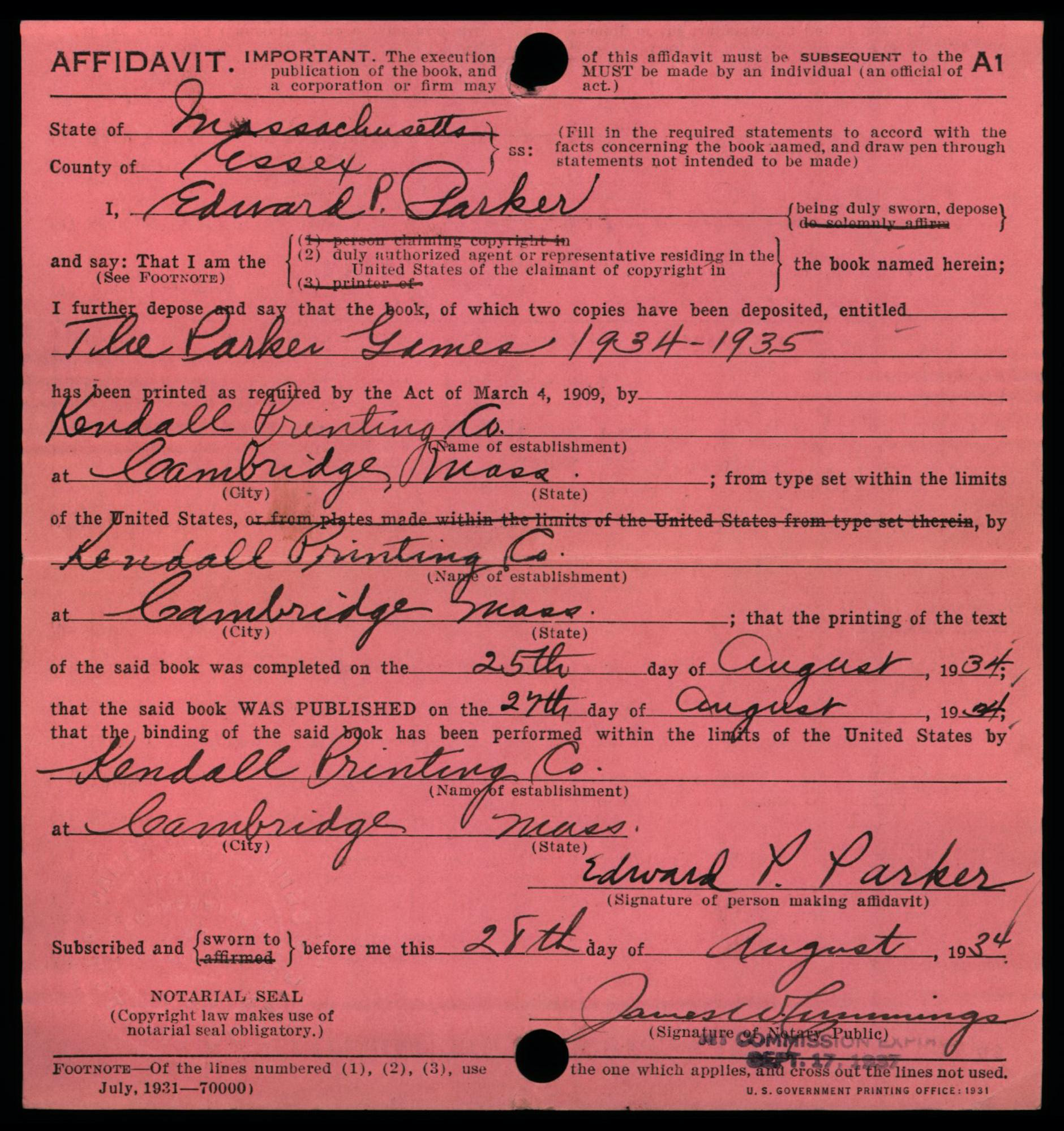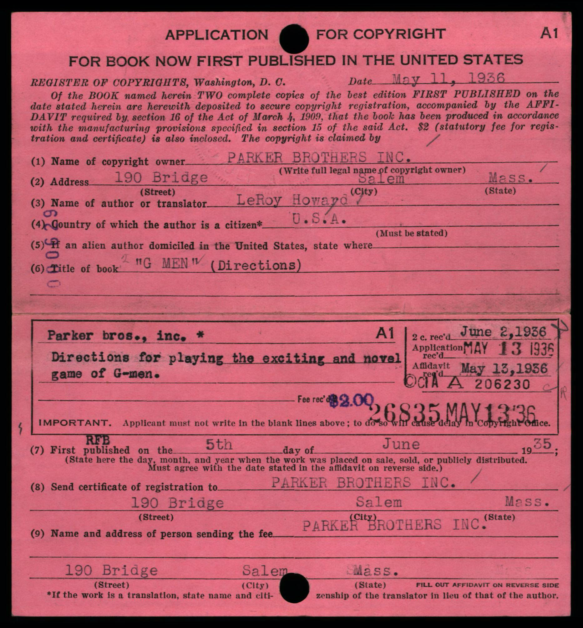 On the above version of the form, the section reserved for use by the Copyright Office appears below the fold in the center. These forms were folded in half and then punched with a hole for placement in a card catalog drawer; a long metal rod goes through all of the holes to keep the card secure within the drawer.