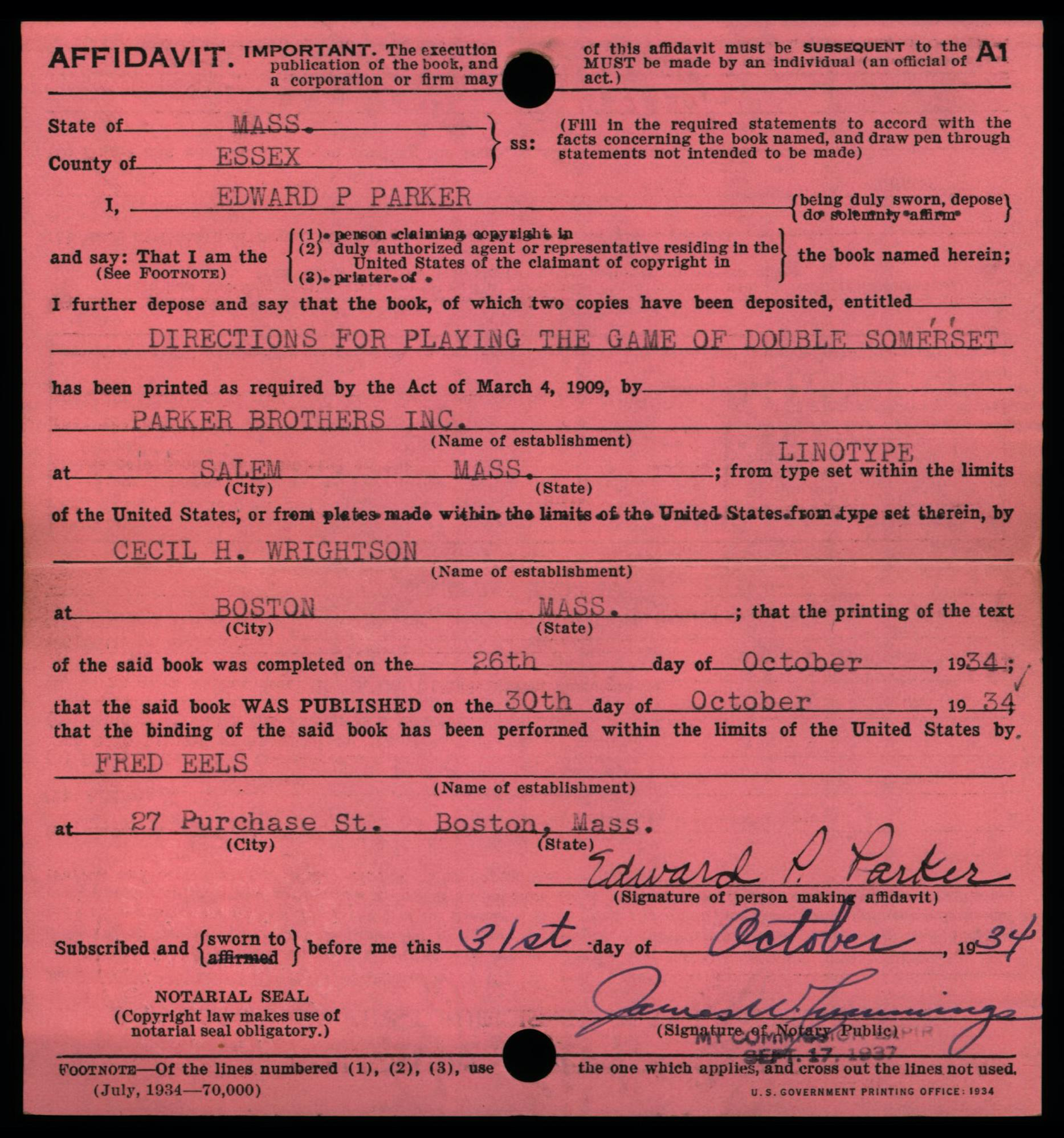 On the form above, the top part (above the double lines) was reserved for use by the Copyright Office. The remainder of the form (both sides) was prepared by the copyright claimant or an agent/representative of the claimant, or the publisher (also termed a “printer”).