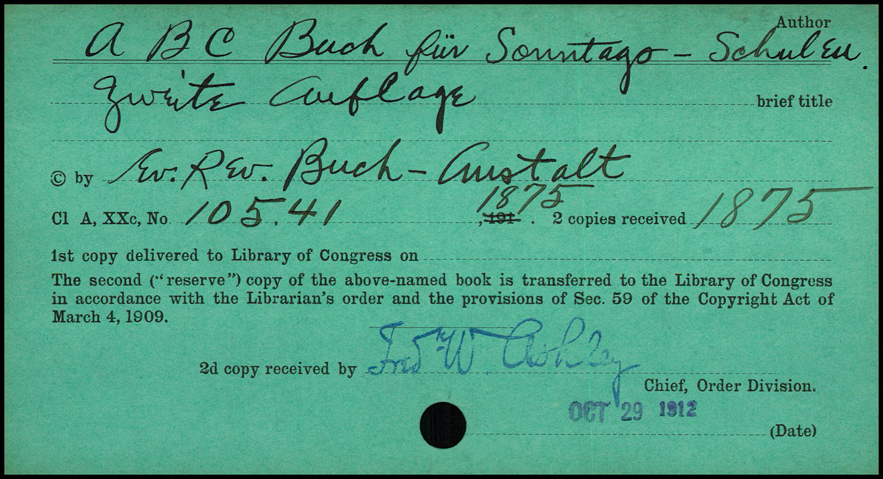 The card is preprinted with a date of “1912” for use in the decade of the 1910s. However, it was filled out with information for a work registered in 1875, “A B C Buch für Sonntags- Schuler Zweite Auflage” (in German; translates to “A B C Book for Sunday School Second Edition”) by “Ev. Rev. Buch-Austalt”, with registration number 10541 (it is to be determined whether this number is sequentially numbered in 1875 or in the 1910s.). The card is stamped with the signature of “Fred’k W Ashley”, the “Chief, Order Division”, on “OCT 29 1912”, 37 years later.
