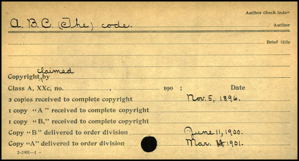 While the top line is intended to be the “Author” name, on this card, the title of “A. B. C. (The) code.” is shown instead. The second line, preprinted with “Brief title”, is blank as used on this card.