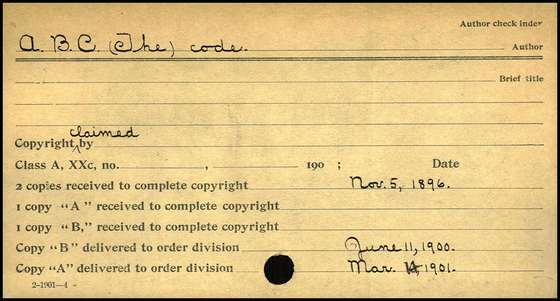 Note that the date of “Nov. 5, 1896” is given on the line preprinted with “2 copies received to complete copyright”, while the next two lines (‘1 copy “A,” received to complete copyright’ and ‘1 copy “B,” received to complete copyright’) are left blank. The bottom two lines, however, are filled in: ‘Copy “B” delivered to order division’ as “June 11, 1900” and ‘Copy “A” delivered to order division’ as “Mar. 14, 1901.”