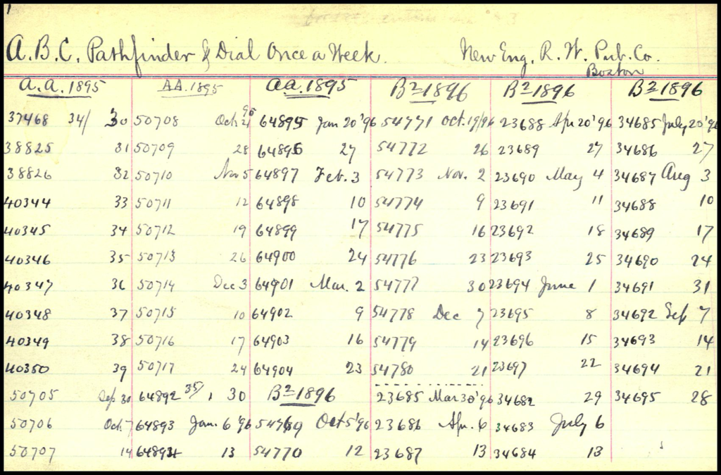 The card above lists numerous issues of a periodical, “A. B. C. Pathfinder & Dial Once a Week” by “New Eng. R. W. Pub. Co. Boston” (New England Railway Publication Company in Boston, Massachusetts) on a card from 1895 to 1896.